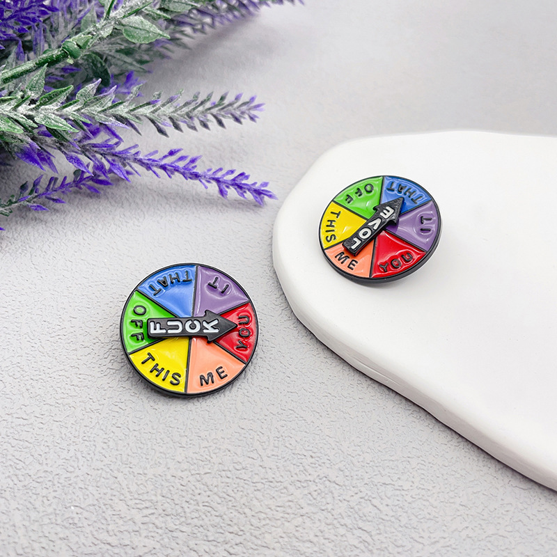 | nameOriginal | New creative rotatable arrow letter brooch Fuck rainbow social metal turntable badge multifunctional accessories |