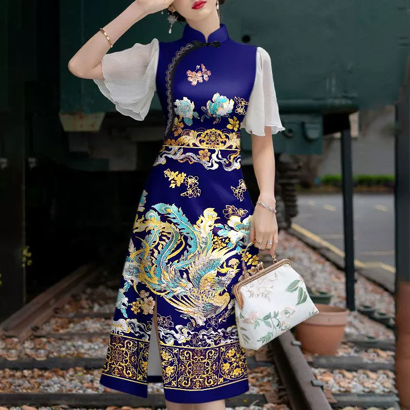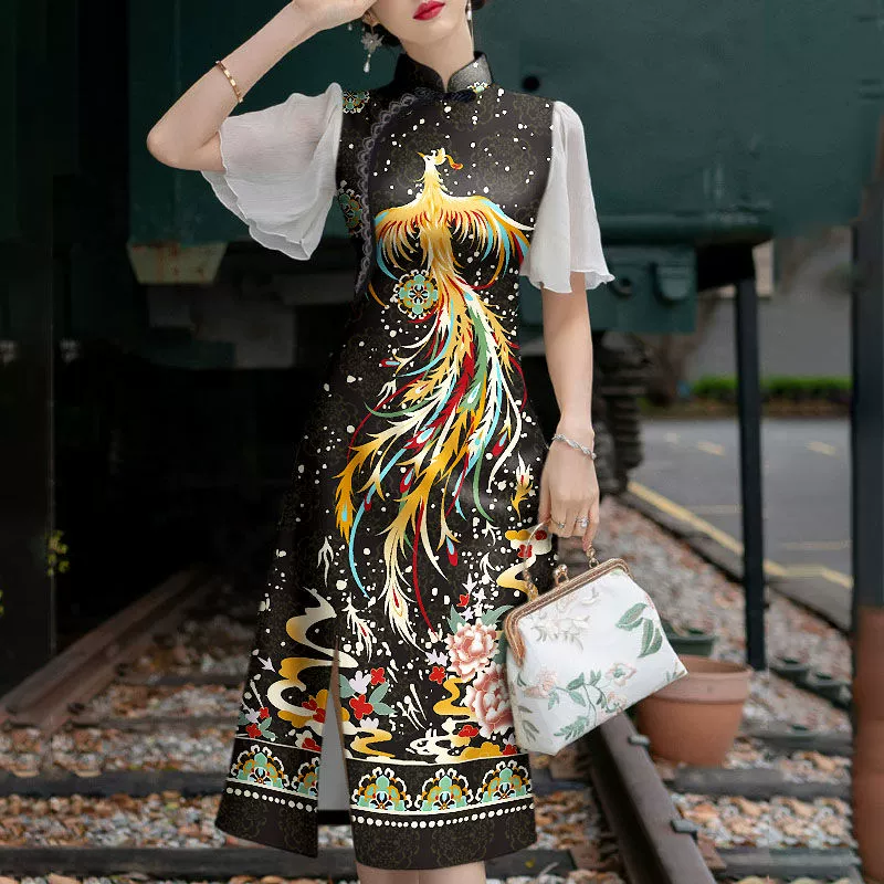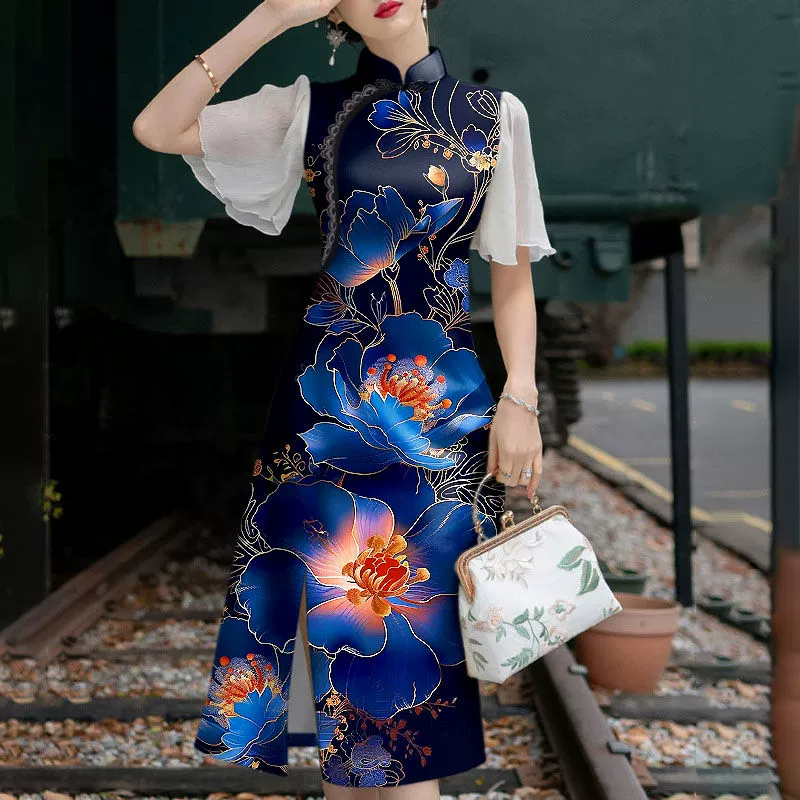 | nameOriginal | New design of improved cheongsam skirt with inverted large sleeves, youthful and niche temperament, printed slits, fresh, elegant and noble |