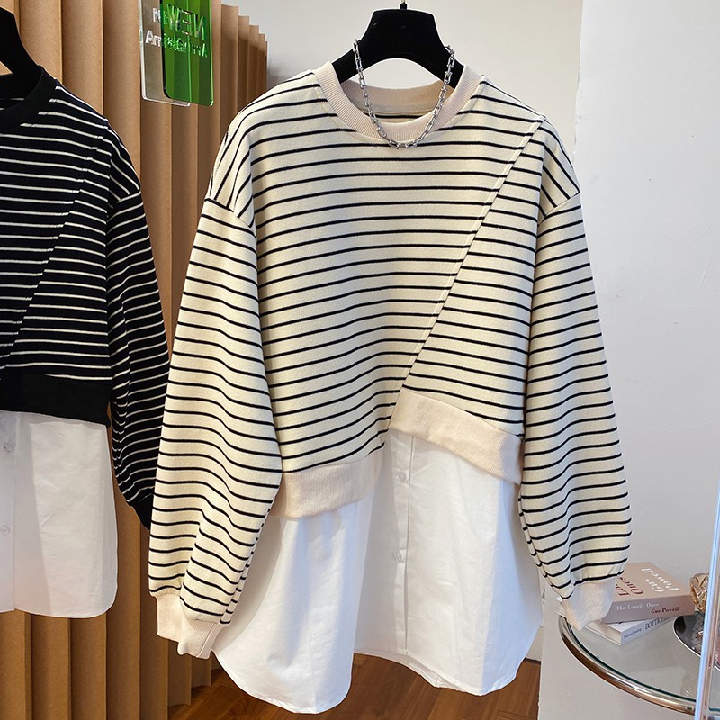 | nameOriginal | New Design Sense Niche Loose Casual Fat m300 Jin Shirt Stitching Striped Sweat Fake Two-piece Chic Top |