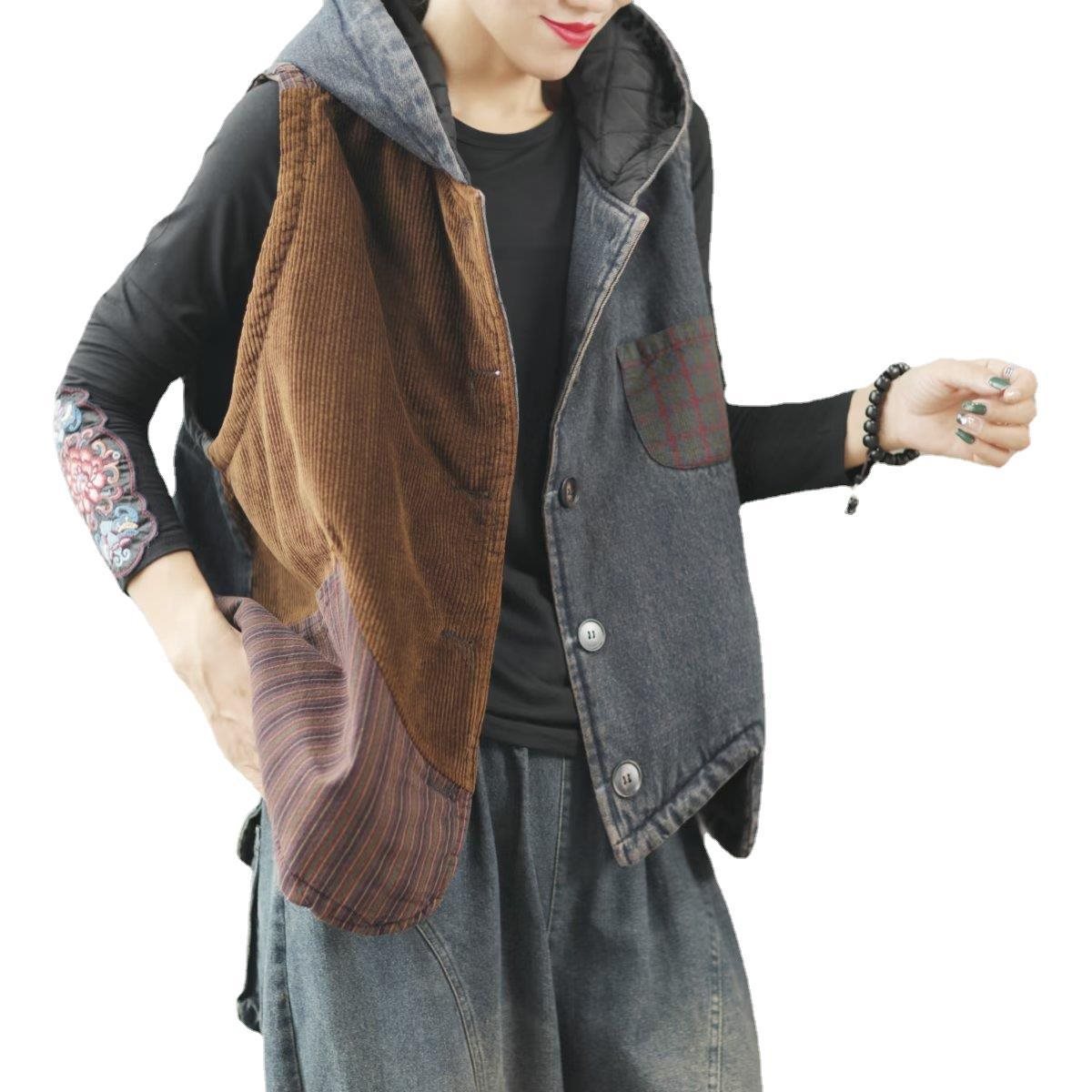 New Distressed Distinctive Color Blanket Padded Cotton Denim Vest Top Women's Outer Wearing Hooded Vest