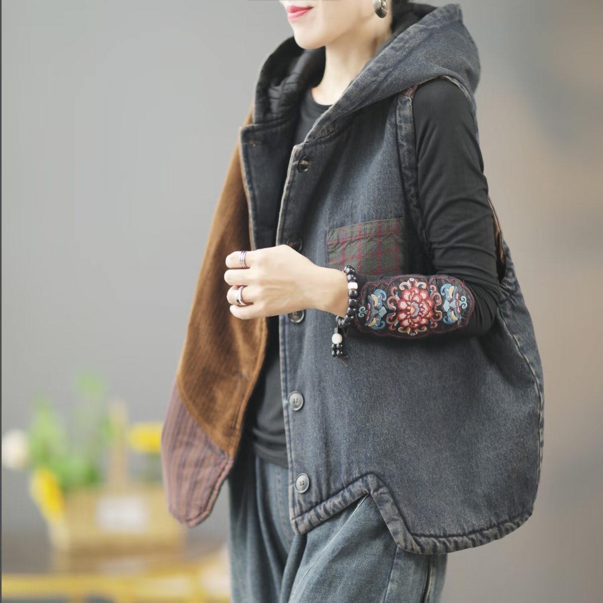 New Distressed Distinctive Color Blanket Padded Cotton Denim Vest Top Women's Outer Wearing Hooded Vest