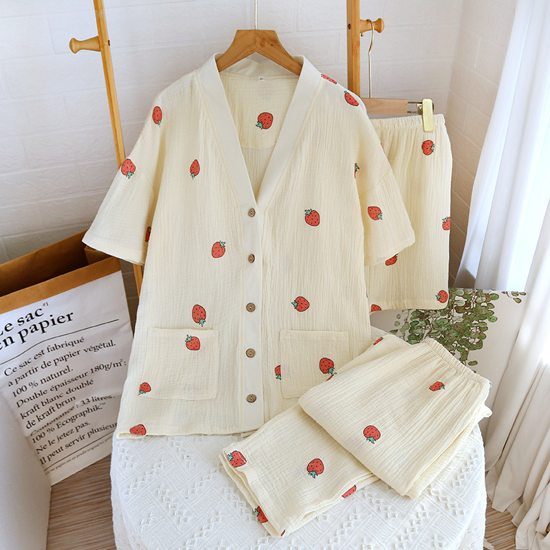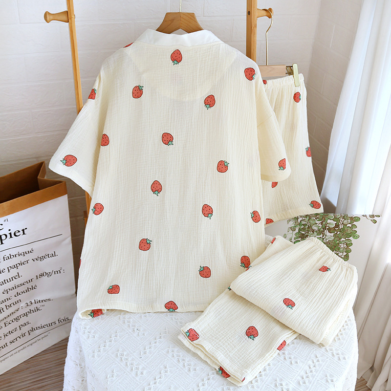 New double-layer crepe strawberry fresh cotton pajamas suit women’s home wear long-sleeved trousers home living clothes