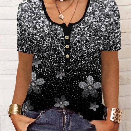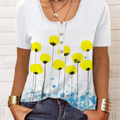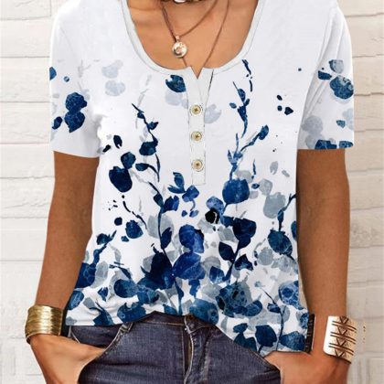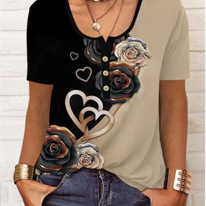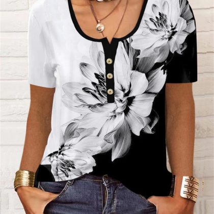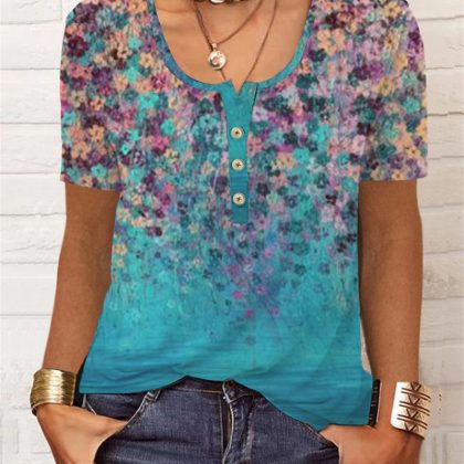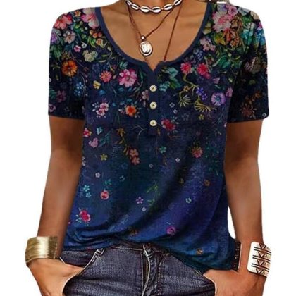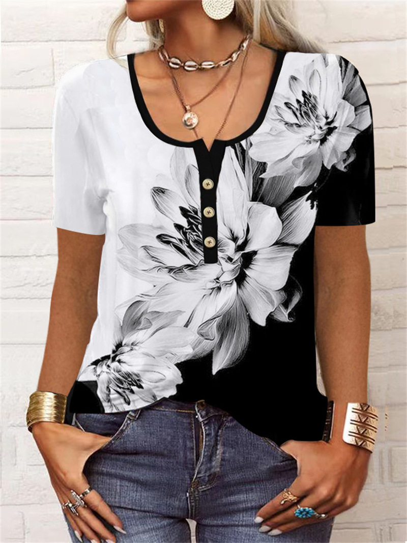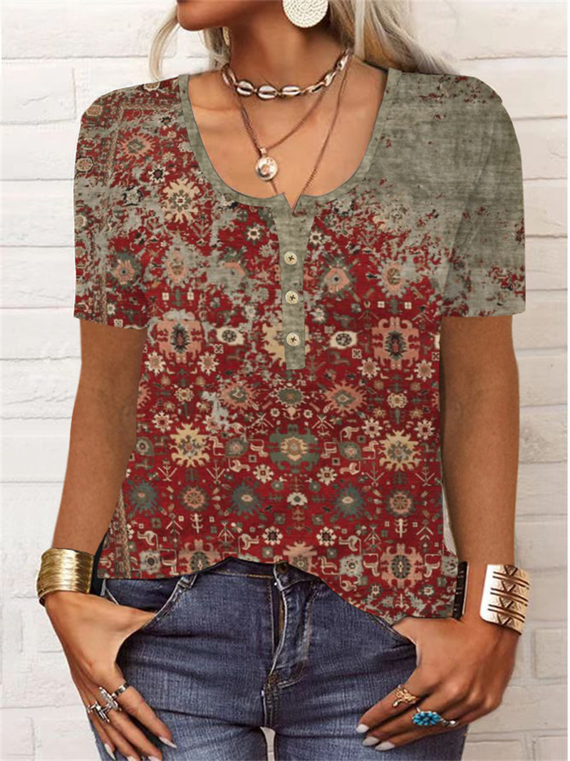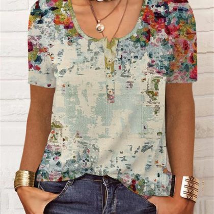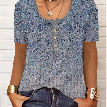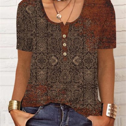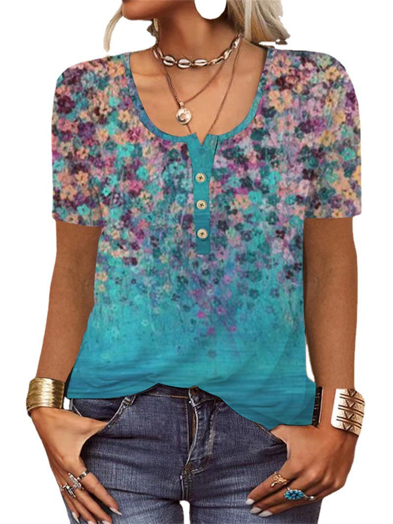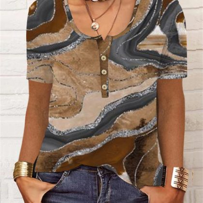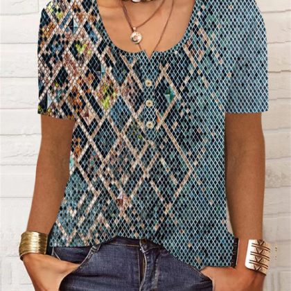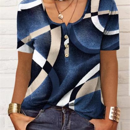 | nameOriginal | New European Code Amazon Independent Station wish2023 Summer Loose Short-sleeved Geometric Pattern U-collar Button T-shirt for Women |