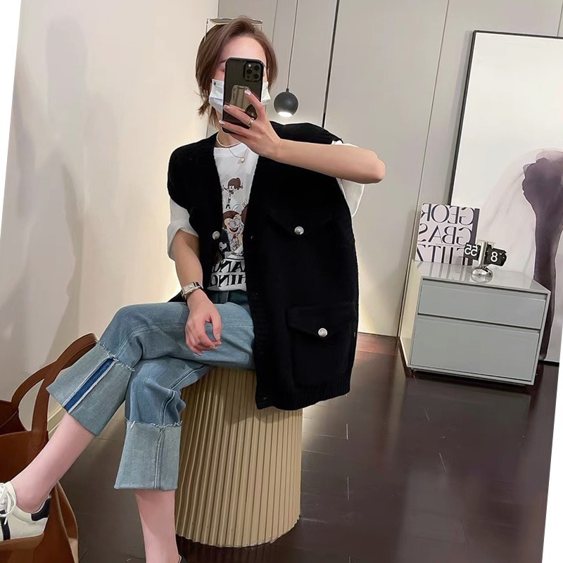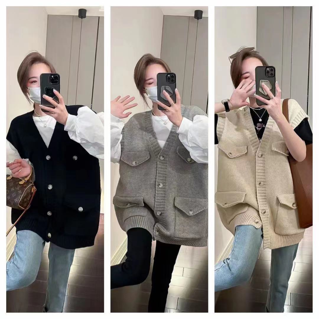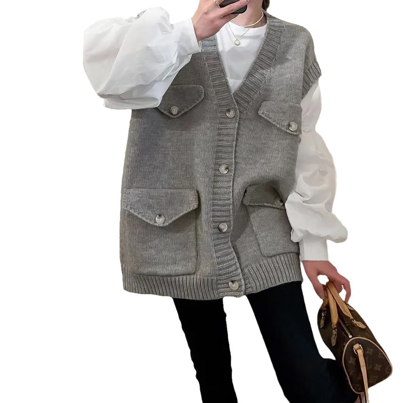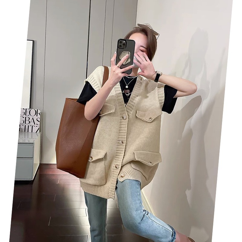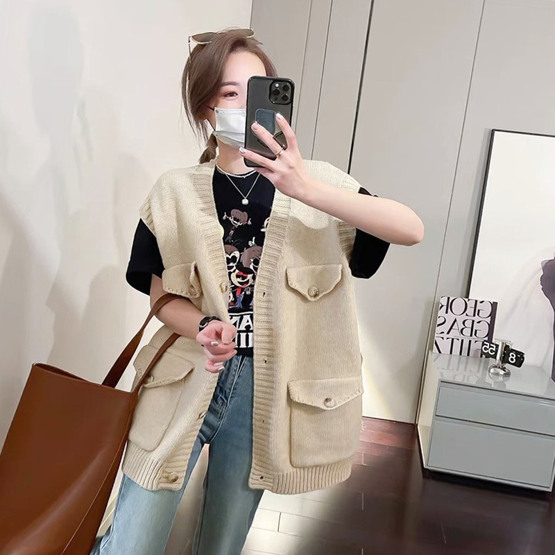 New European Heavy-duty Large Pocket Large Size Knitted Vest Women’s V-neck Loose Sleeveless Stacked All-match Solid Color Vest