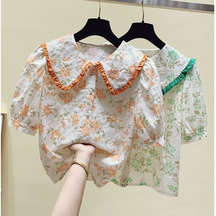 New Girls’ Summer Doll Collar Floral Shirt Cotton Short Sleeve 2024 Mid-Large Children’s Top Chiffon