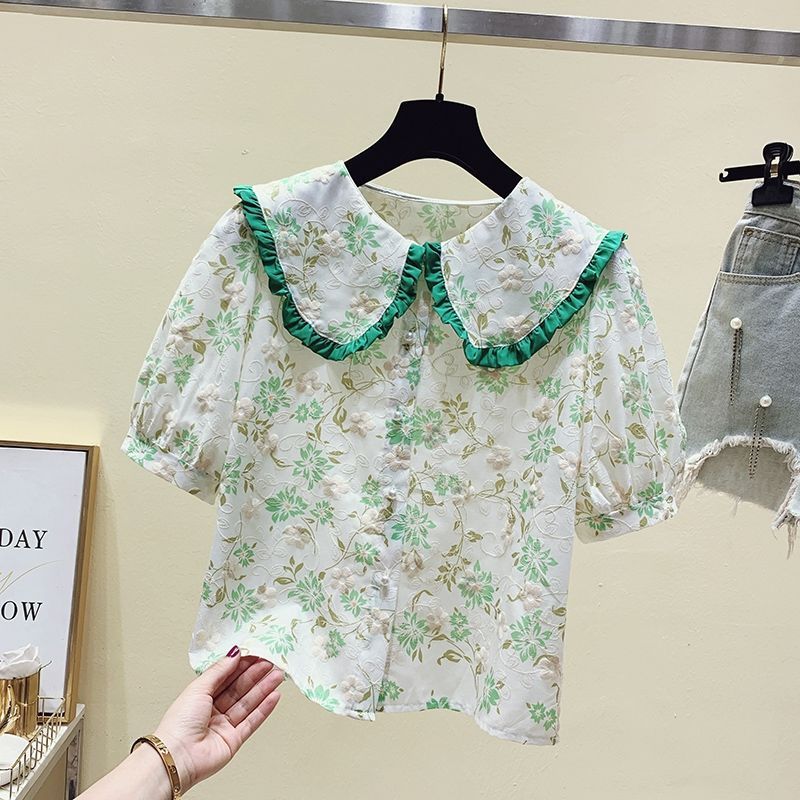 New Girls' Summer Doll Collar Floral Shirt Cotton Short Sleeve 2024 Mid-Large Children's Top Chiffon