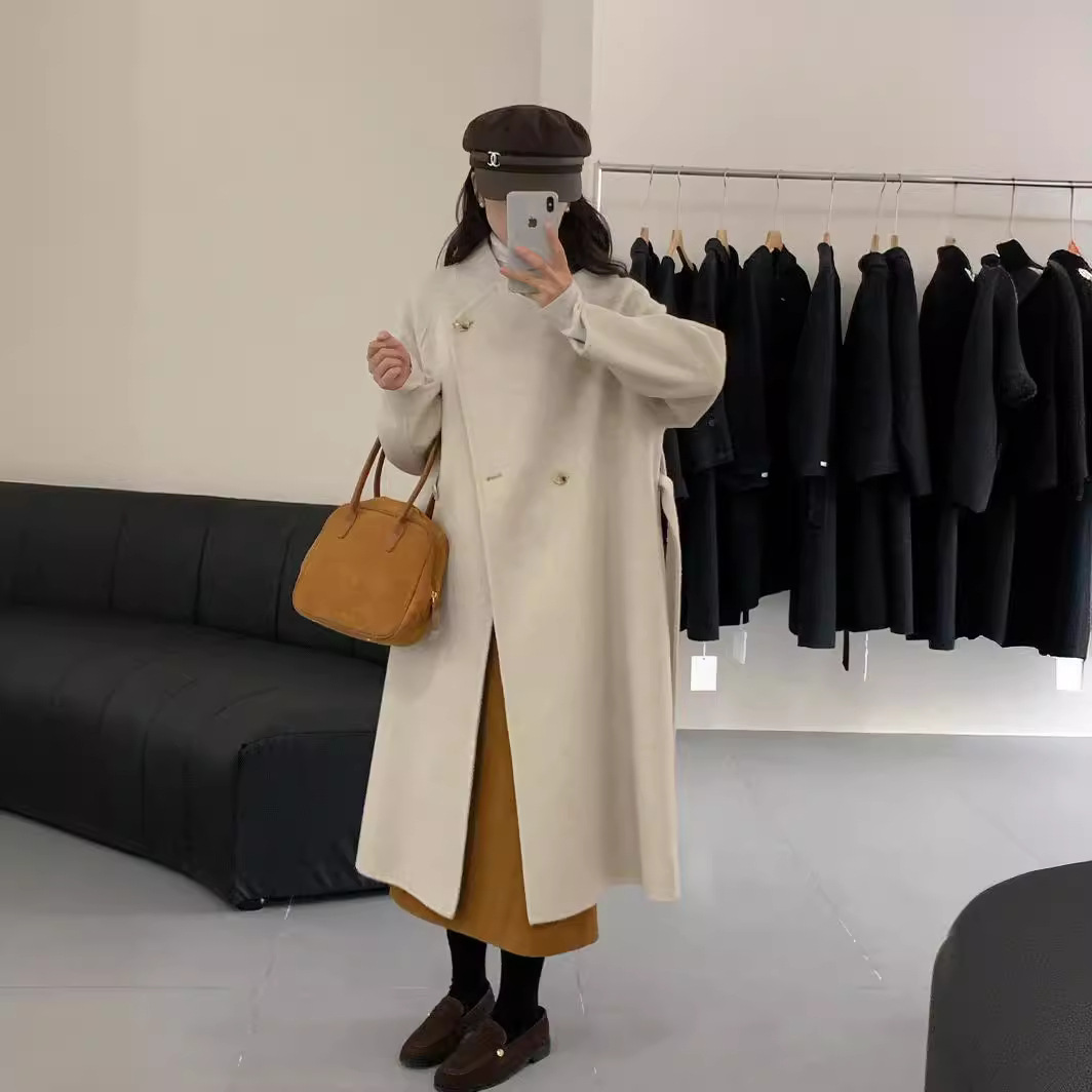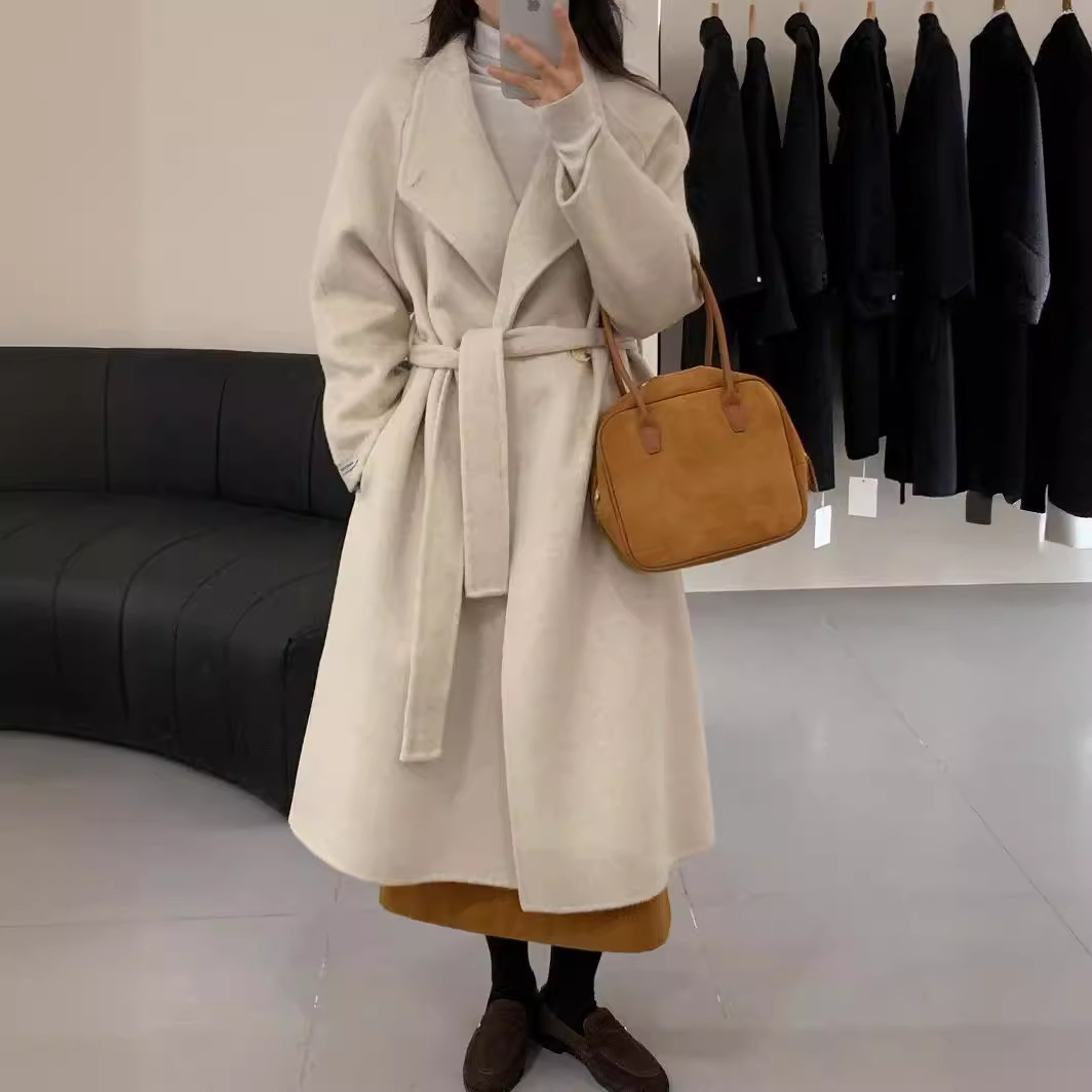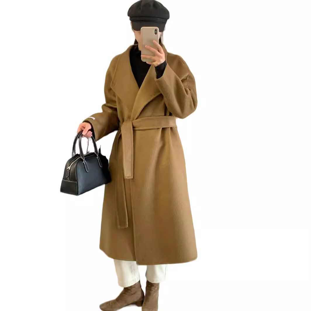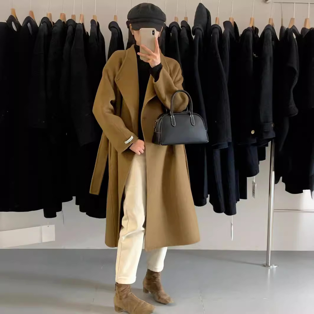 | nameOriginal | New high-end double-sided cashmere coat autumn and winter mid-length over-the-knee stand collar loose waist lace-up woolen coat |