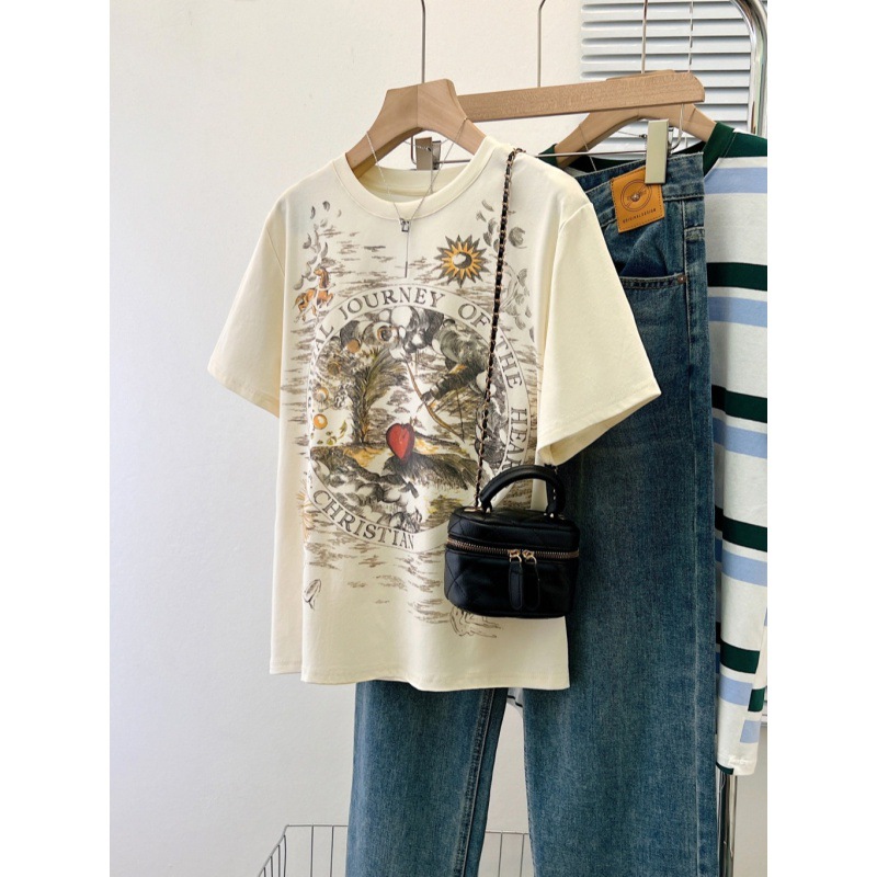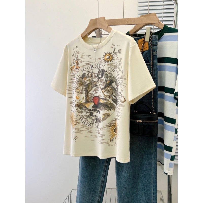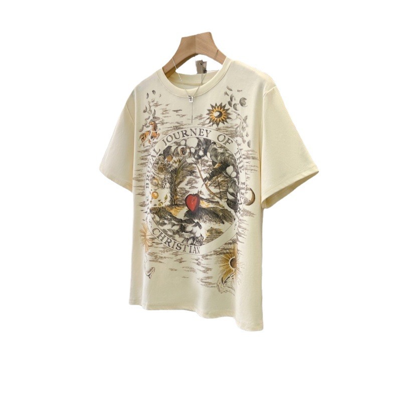 | nameOriginal | New Ink Painting Printing Short-sleeved T-shirt Women's 2024 Summer Round Neck Design Sense Retro Loose Shoulder Top for Women |