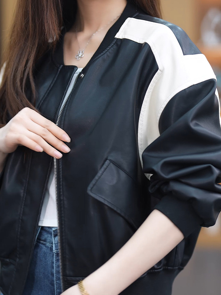 New Leather Jacket Women's Color-block Design Baseball Suit Spring and Autumn 2024 pu Leather Jacket Biker Jacket Top