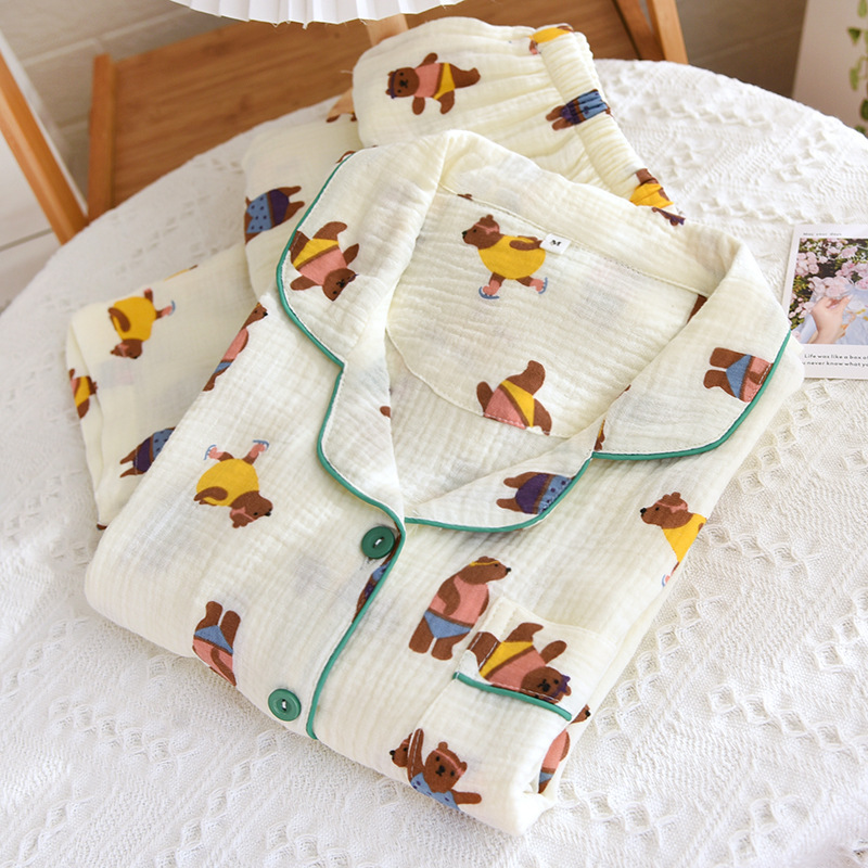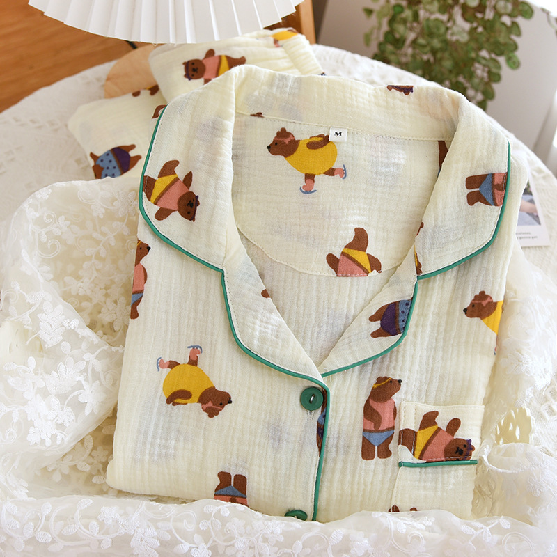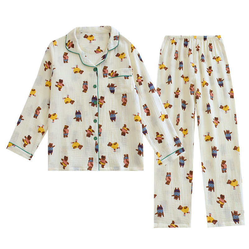 New long-sleeved trousers pajamas suit cotton crepe summer thin home wear simple cardigan loose two-piece suit