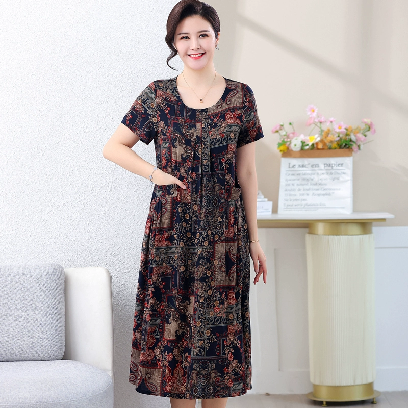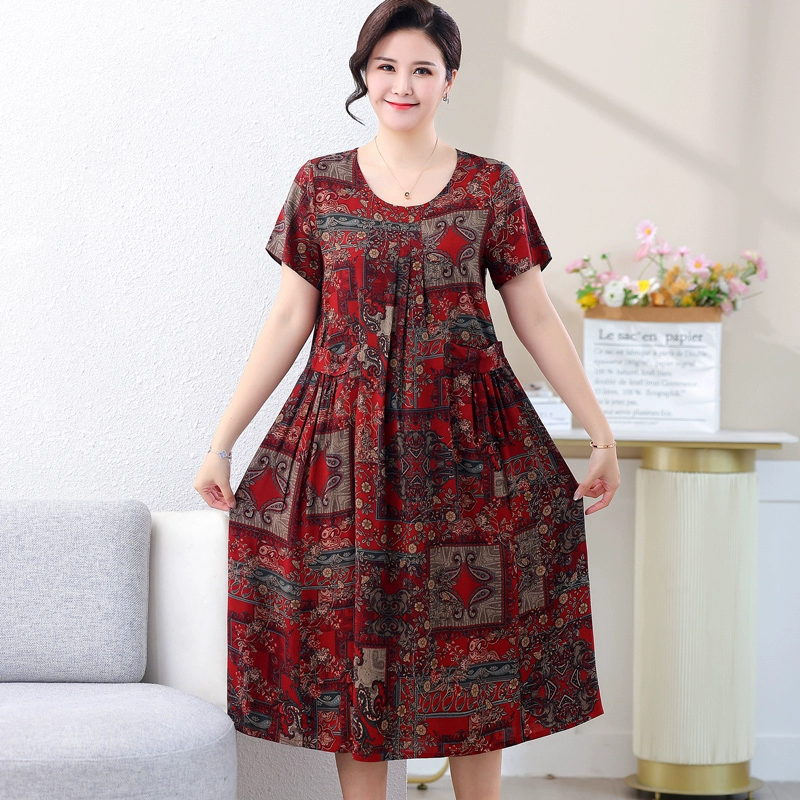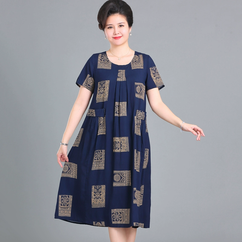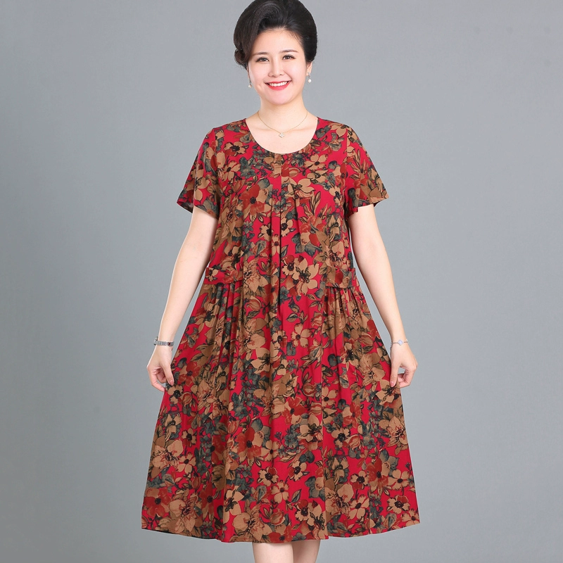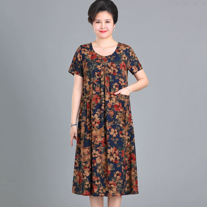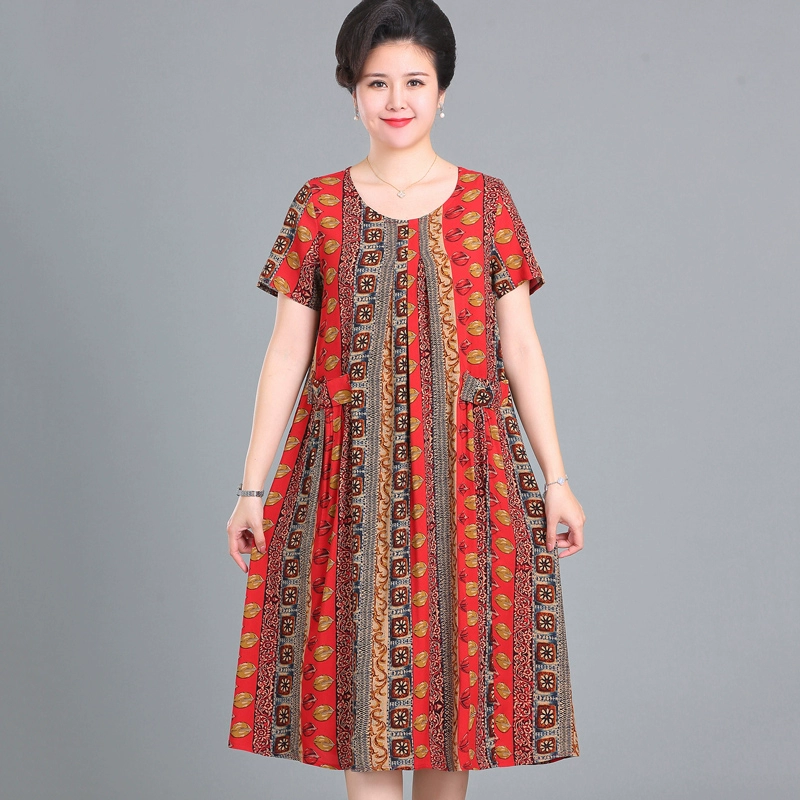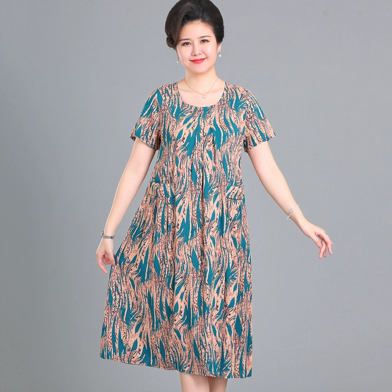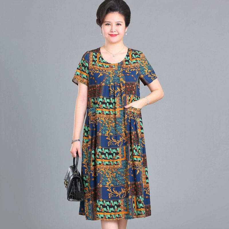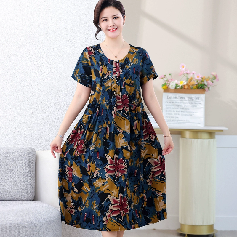 | nameOriginal | New mother's summer cotton silk dress loose belly-covering middle-aged and elderly plus size women's colorful skirt |