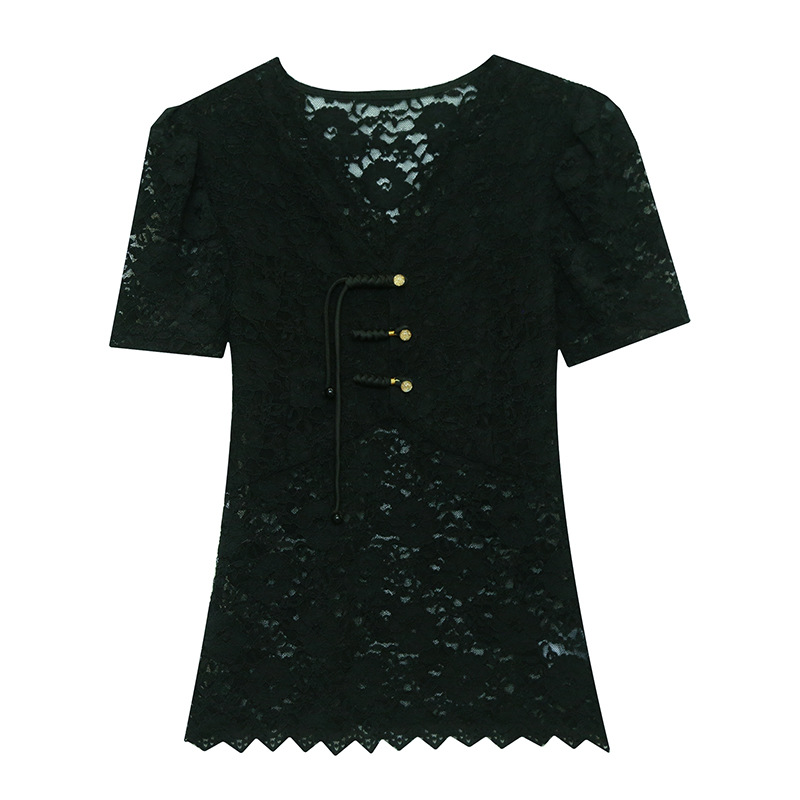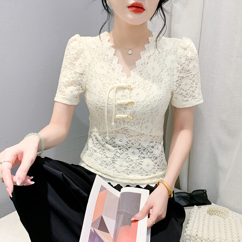 | nameOriginal | New National Style Elegant V-neck Lace Hollow Lace Shirt Women's Summer New Design Sense Slim-fit Base Short-sleeved Top |