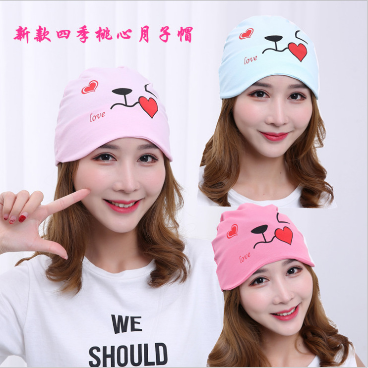 | nameOriginal | New peach heart moon cap combed cotton elastic birth woman cap pregnant woman cap sitting moon cap wind-proof cap moon cap |