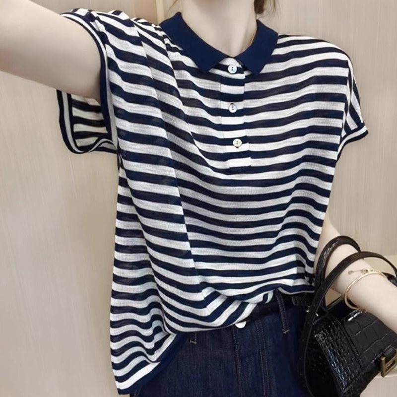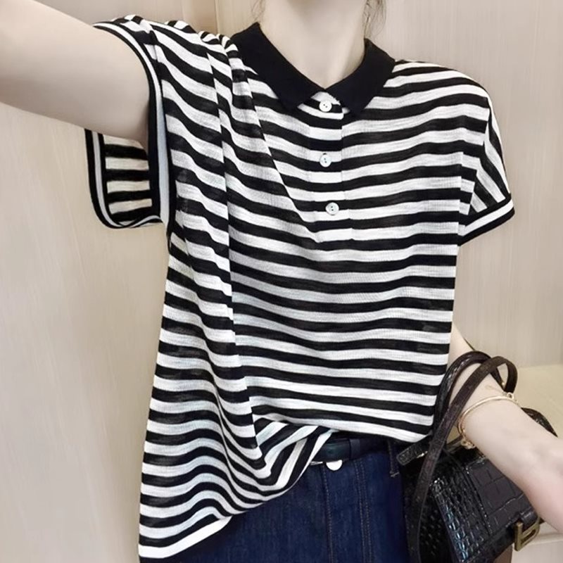 New Polo Shirt Short-sleeved Striped Top Design Sense T-shirt Western Style All-match Base Shirt Women's Korean Style Age-reducing Casual