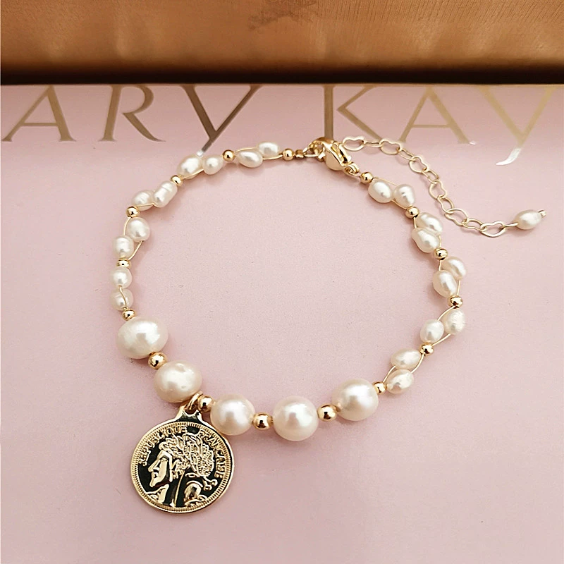New retro niche design ins high-end touching avatar gold coin natural pearl bracelet student forest style simple