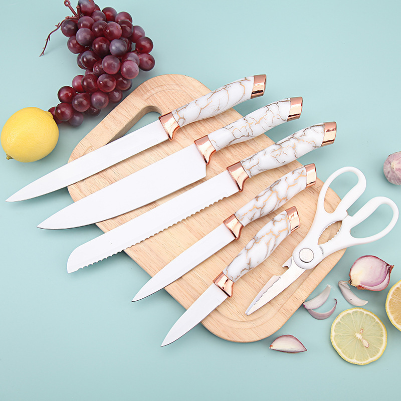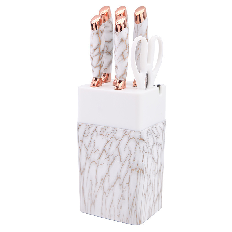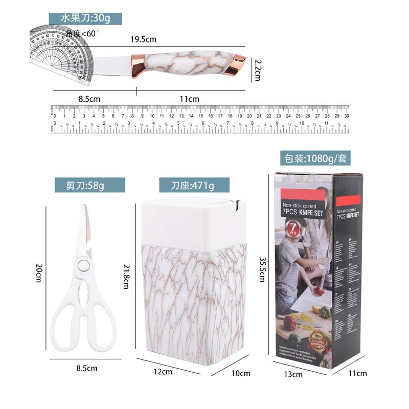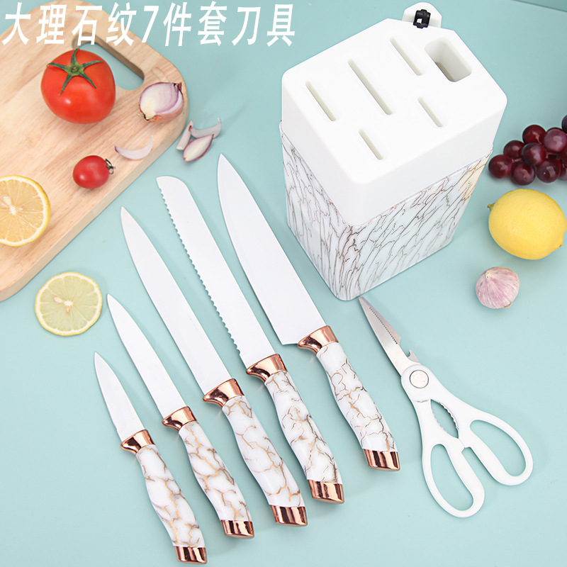 | nameOriginal | New stainless steel marble pattern seven-piece knife double plating head square seat cutter with color box cutter suit |