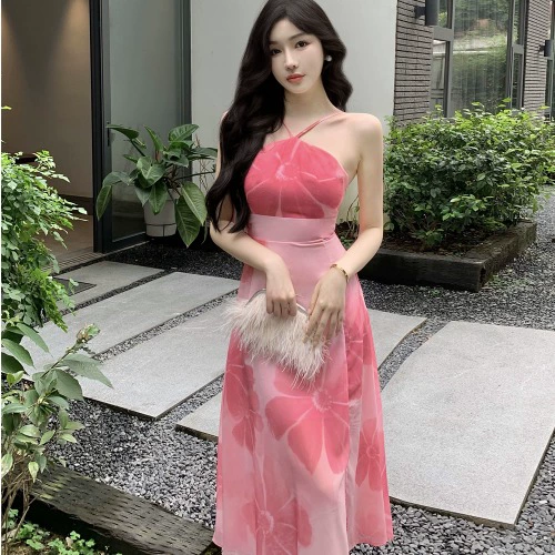 New style French print dress with slim waist and halter neck