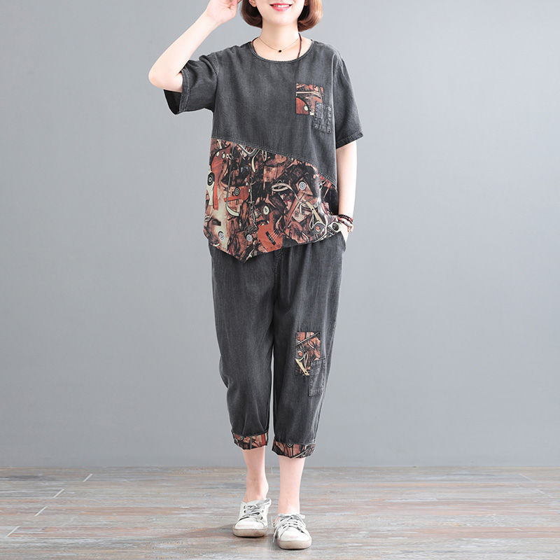 | nameOriginal | New Summer suit Women's Fashion Stylish plus size Loose Cotton Thin Denim Short-sleeved Top Two-piece Cropped Pants |