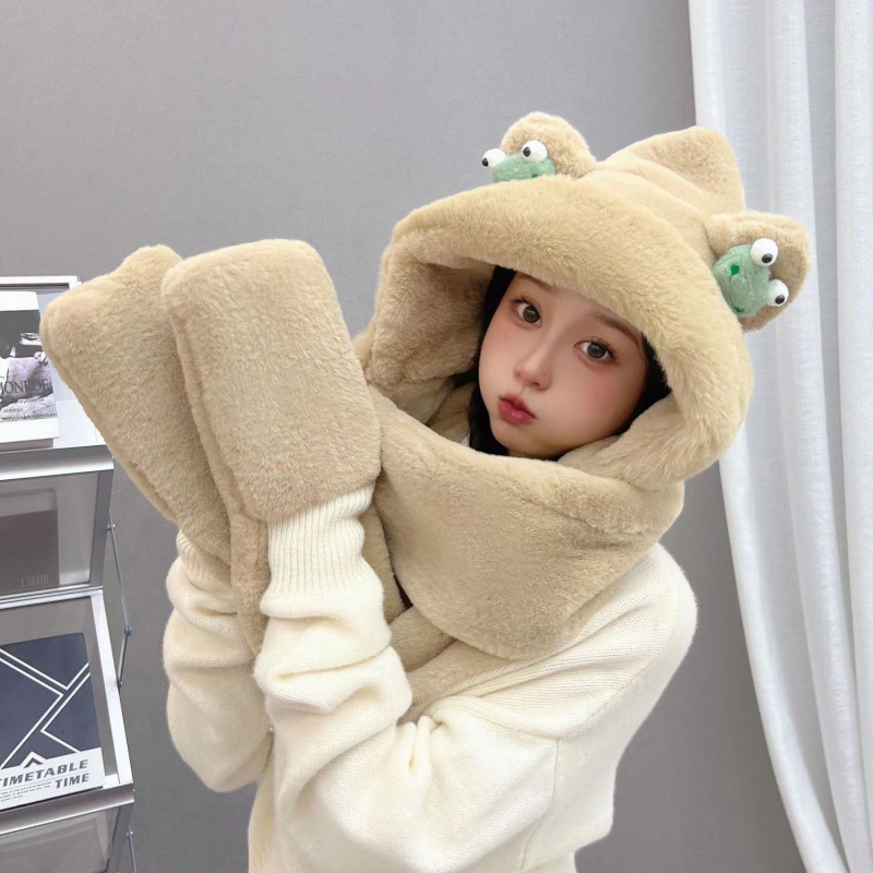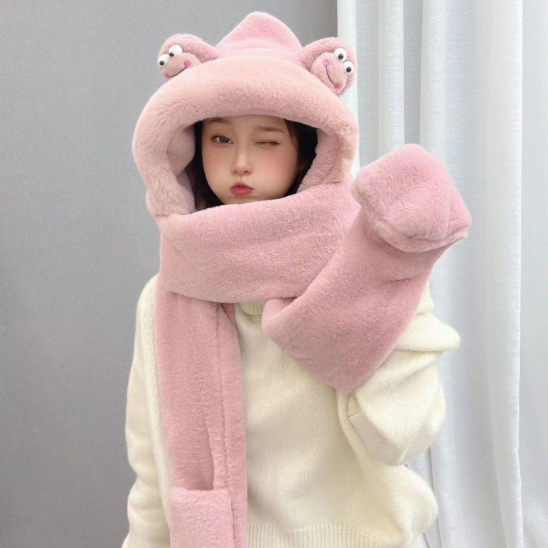 | nameOriginal | New winter hat scarf gloves integrated cold-proof warm Internet celebrity scarf thickened hooded cute three-piece set for women |