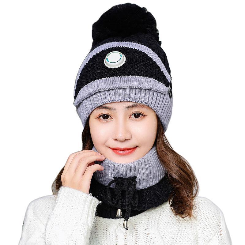 New winter knitted pullover cap scarf set cycling windproof breathing valve knitted cap wool three-piece women’s cap