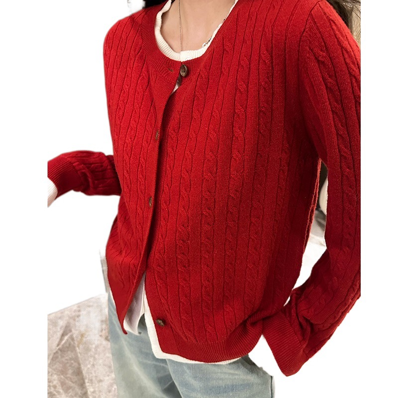 | nameOriginal | New Year Red Fake Two-piece Short Design Sense Niche All-match Knitted Cardigan Round Neck Color Matching Base Top |