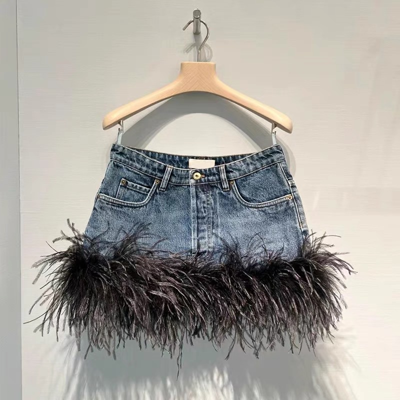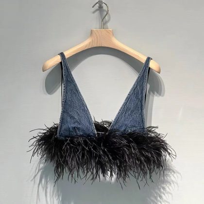 | nameOriginal | Niche design 24 early spring new personalized feather decoration Denim V-neck strap high waist skirt slimming suit |