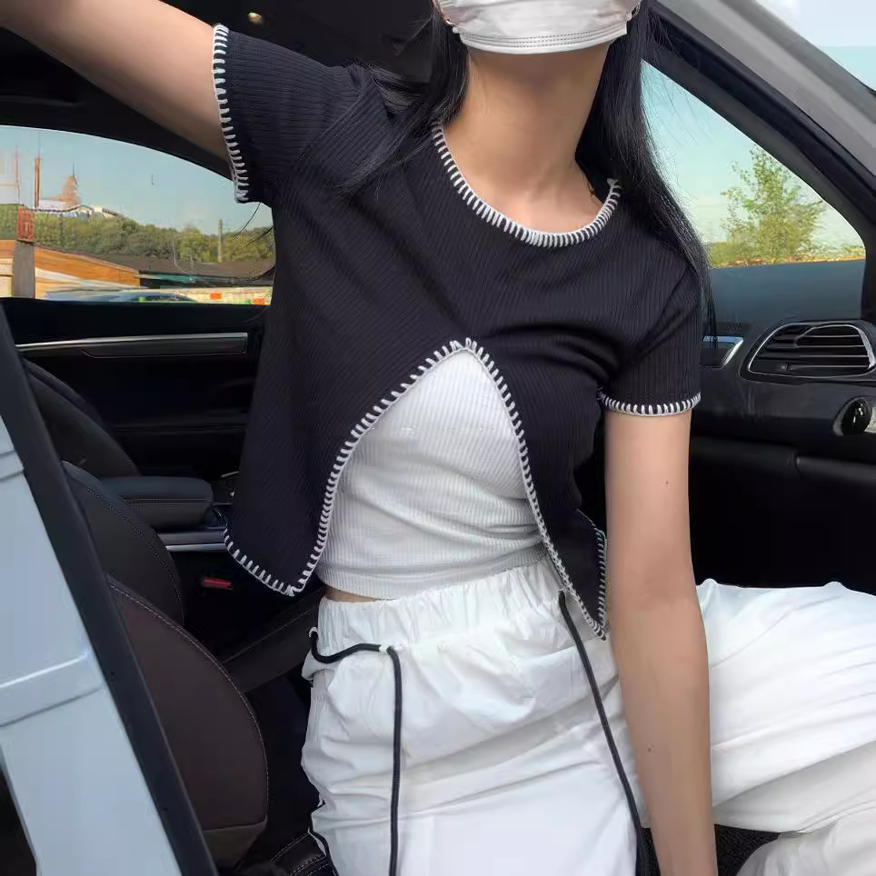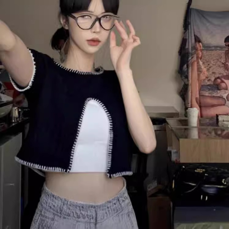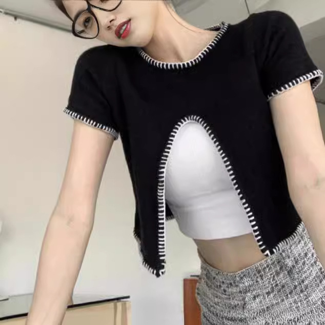 | nameOriginal | Niche Design Chic Split Knitted Short-sleeved T-shirt Women's Summer 2024 New Hot Girl Style Short Top |