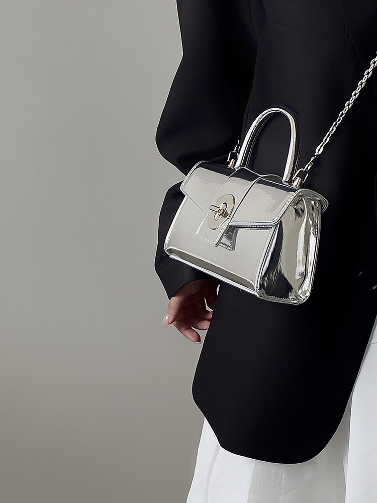 Niche Design Sense Bag Patent Leather silver Motorcycle Small Square Bag Hot Girl Fashion All-match Shoulder Crossbody Bag