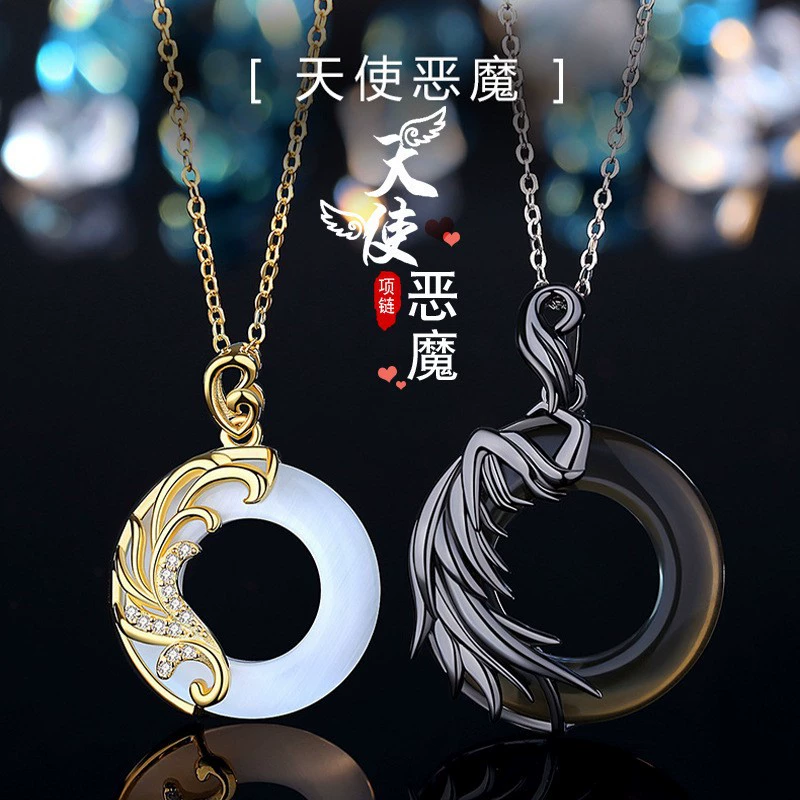 Niche devil couple black and white glass pendant necklace