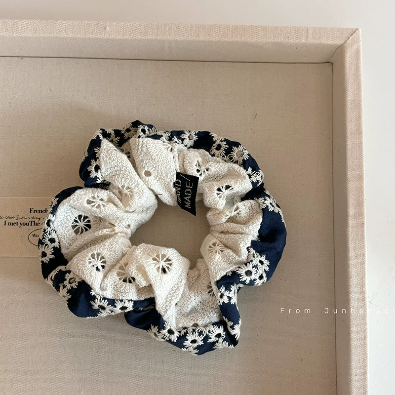 | nameOriginal | Niche ethnic style cotton and linen hollow embroidery small navy blue flower stitching pleated large intestine hair tie ball head |