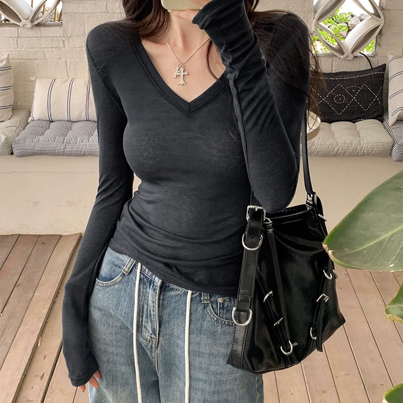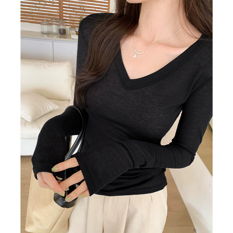 Small v -neck thin long sleeves spring and summer thin top T -shirt