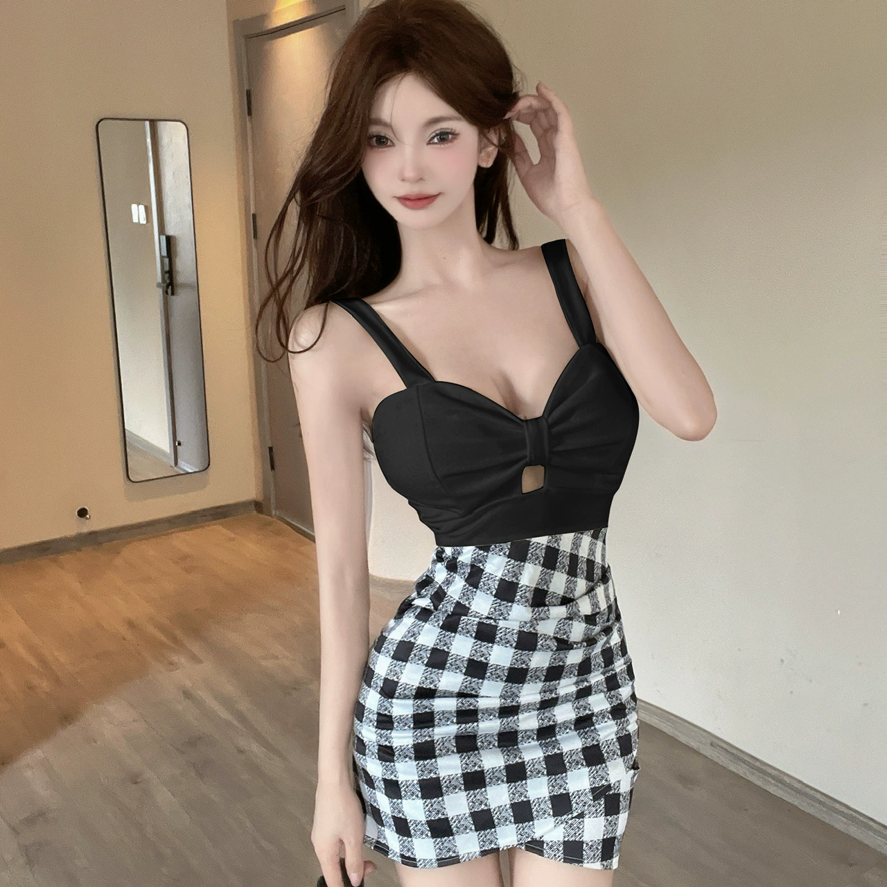 Night club women's sexy v-neck low-cut suspender dress foot bath sauna technician uniform plaid contrasting age-reducing skirt