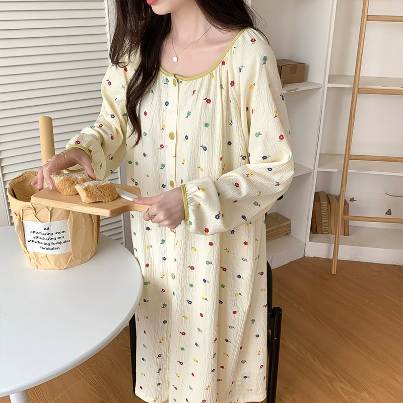 | nameOriginal | Nightgown for women spring and autumn 2024 new sweet floral large size cardigan mid-length pajamas dress home wear |