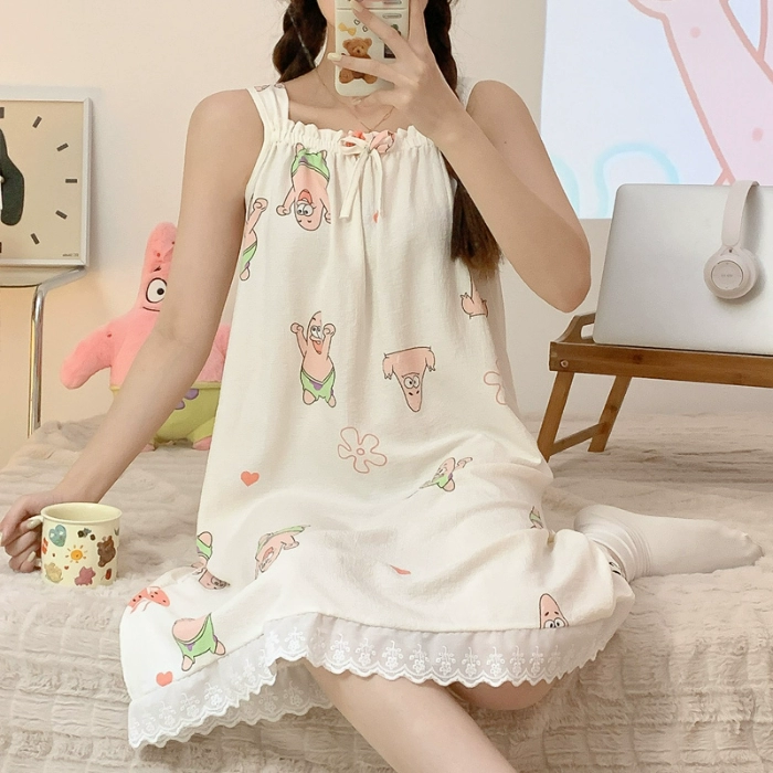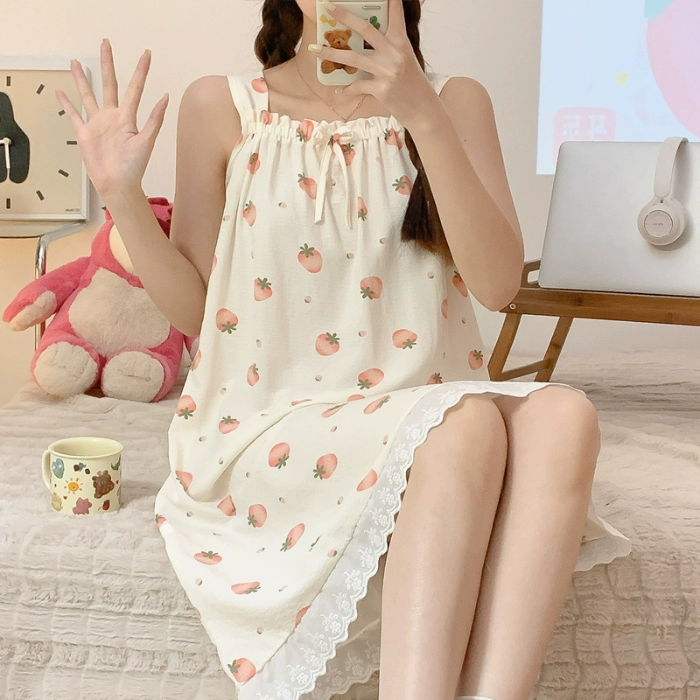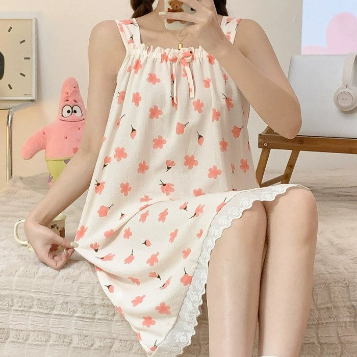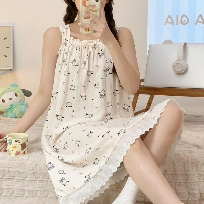 | nameOriginal | Nightgown for women summer suspenders sexy cute sweet woven bubble cotton student loose cartoon home wear pajamas |