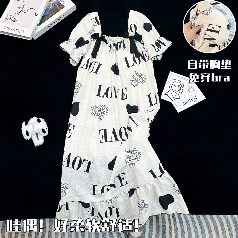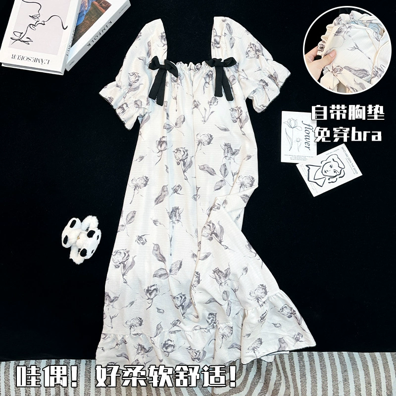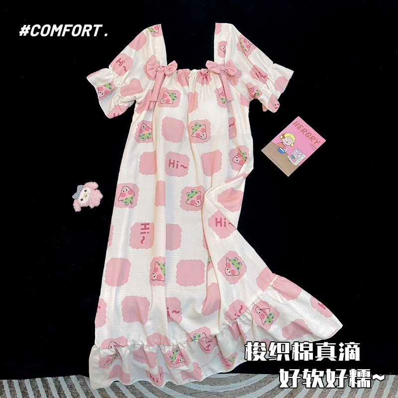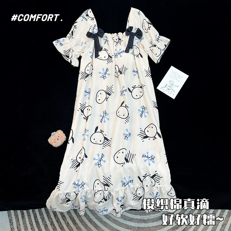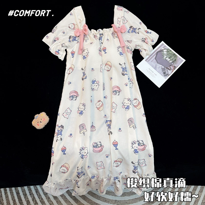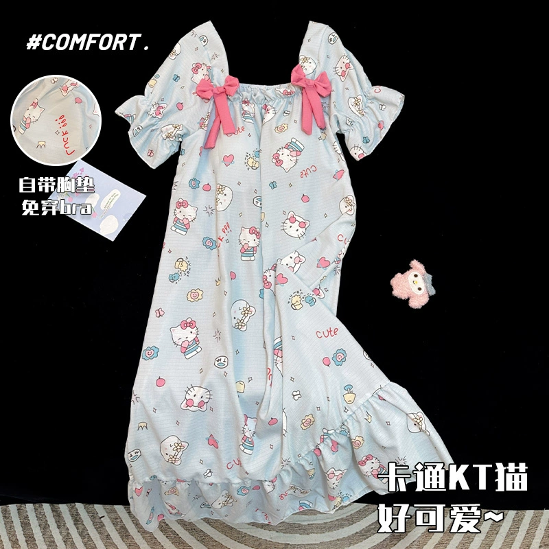 | nameOriginal | Nightgown summer women's 2024 new short-sleeved chest pad woven cotton cartoon KT cat pajamas internet celebrity style home clothes |
