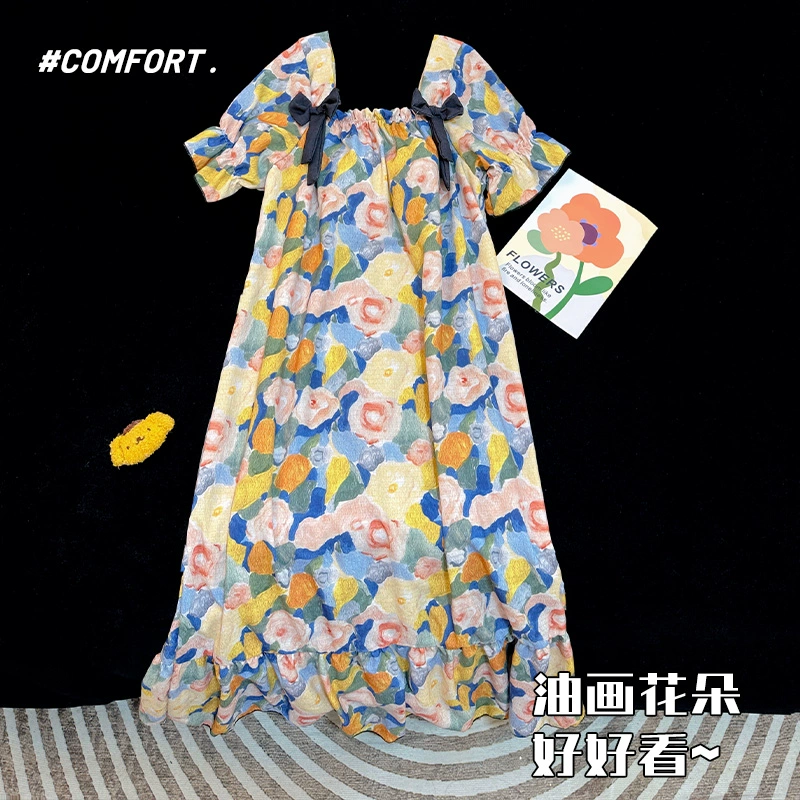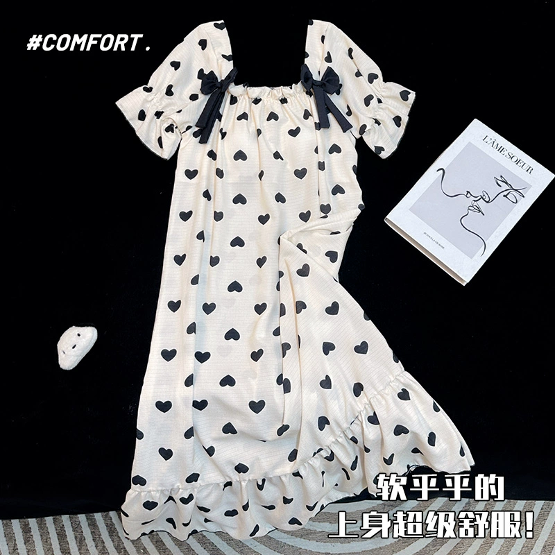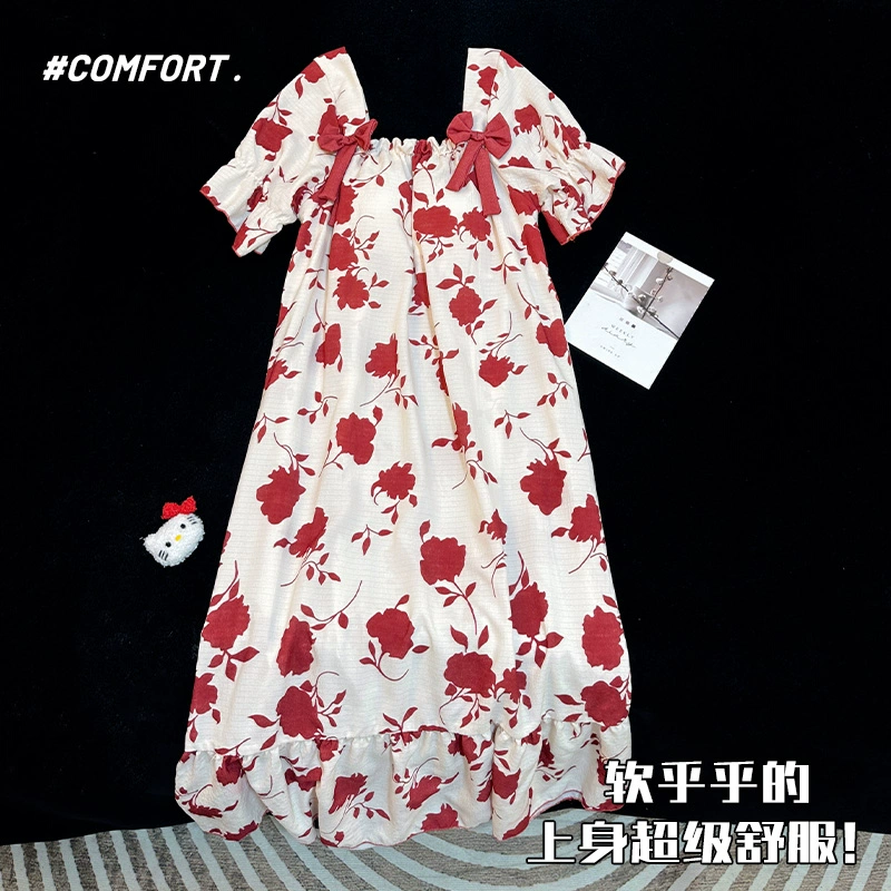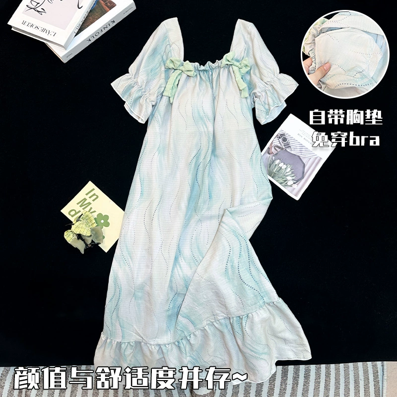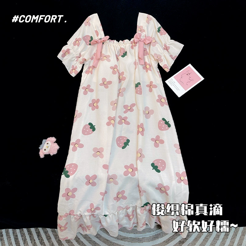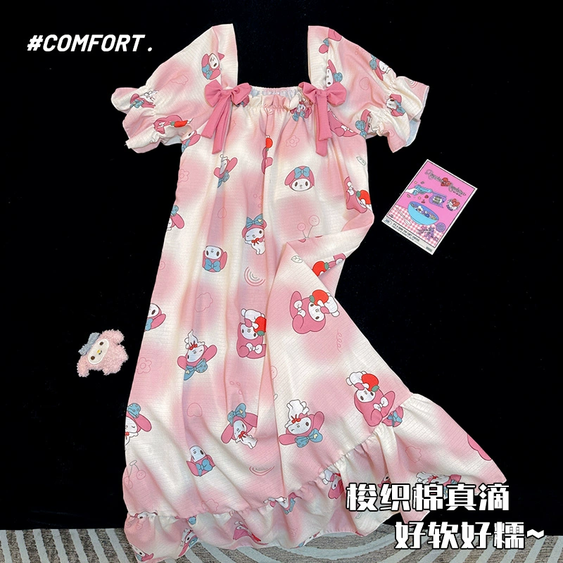 | nameOriginal | Nightgown summer women's 2024 new short-sleeved chest pad woven cotton cartoon KT cat pajamas internet celebrity style home clothes |