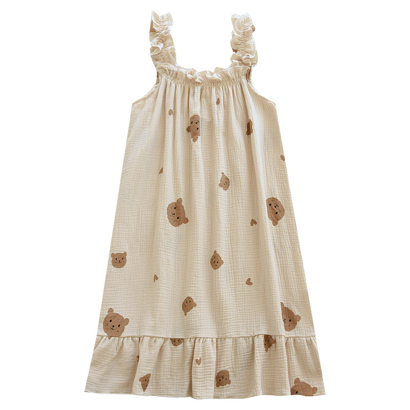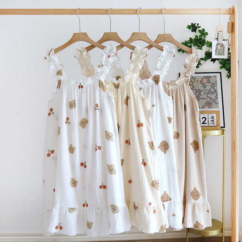 | nameOriginal | Nightgown Women's Summer Crepe Cotton Yarn Pure Cotton Thin Sling Pajamas Loose Midi Cartoon Long Dress Home Clothes |