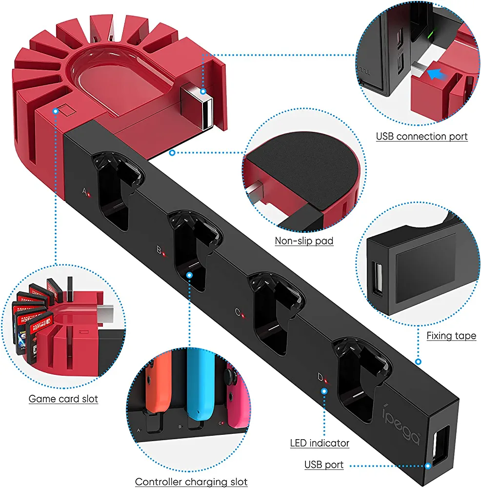 Introducing the ultimate charging solution for your Nintendo Switch Joy-Con controllers – the Charging Dock with 9 Game Card Storage Slots! This sleek and stylish dock is designed to provide fast and efficient charging for your Joy-Con controllers, so you can spend more time gaming and less time waiting for your controllers to charge.