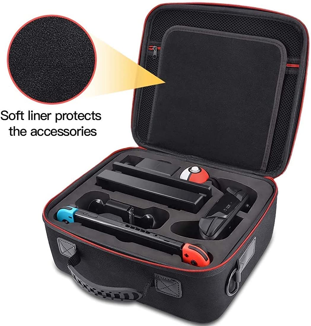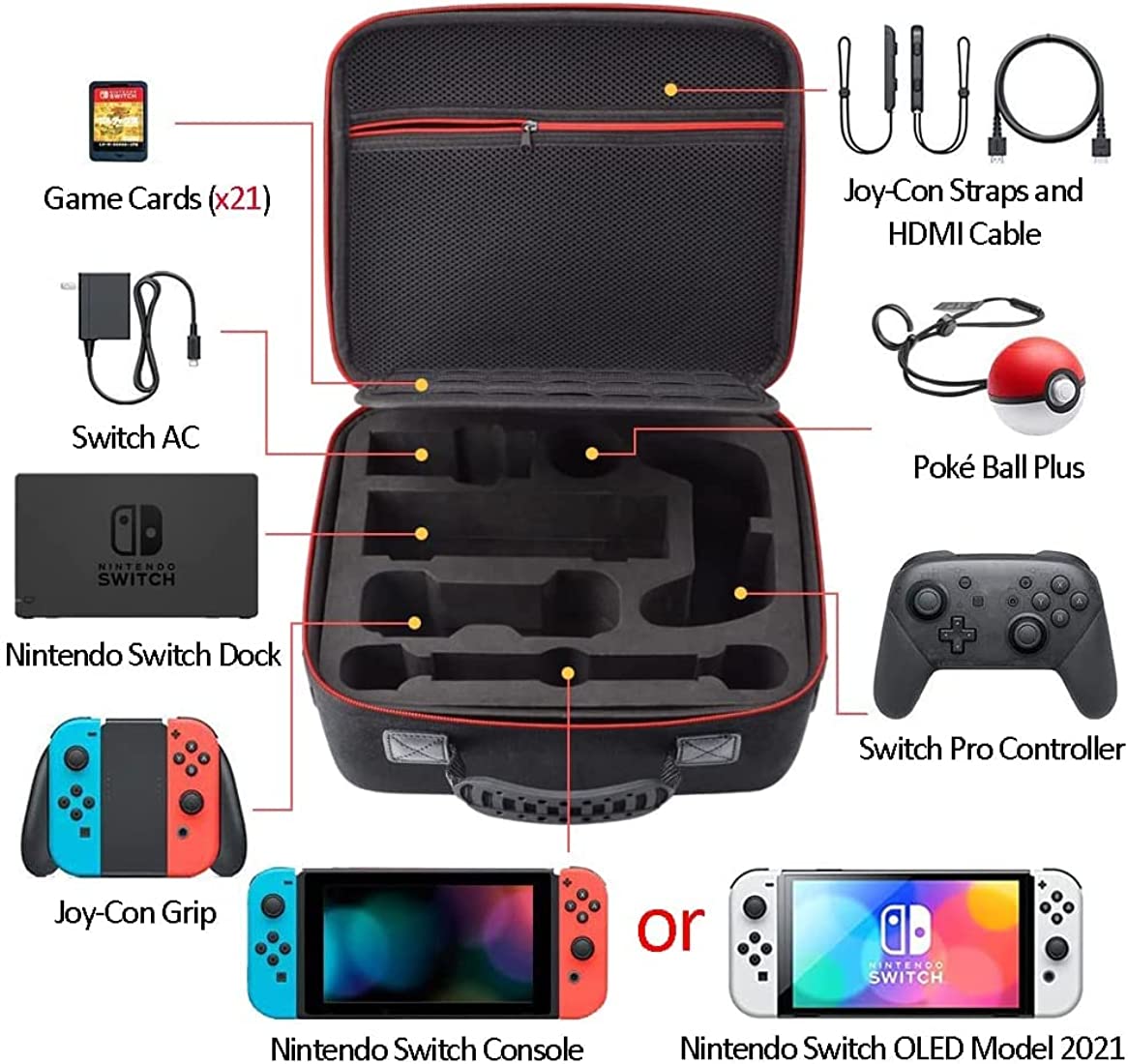 The case is designed to hold your Nintendo Switch or Switch OLED Model (2021) console, Pro Controller, Poke Ball Plus, and other Switch accessories. It features a custom-fit design that ensures a snug and secure fit for all your gear. The case also includes a handle and shoulder strap for easy carrying, making it perfect for travel or commuting.