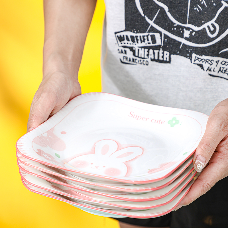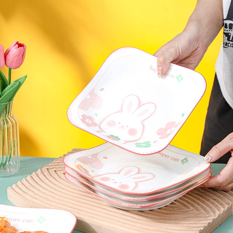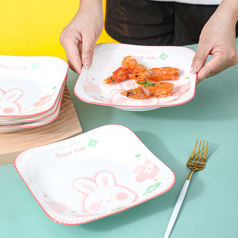 NJE010 plate household ceramic dish Ruyi plate pink cute rabbit deep plate fruit plate square plate tableware disc plate
