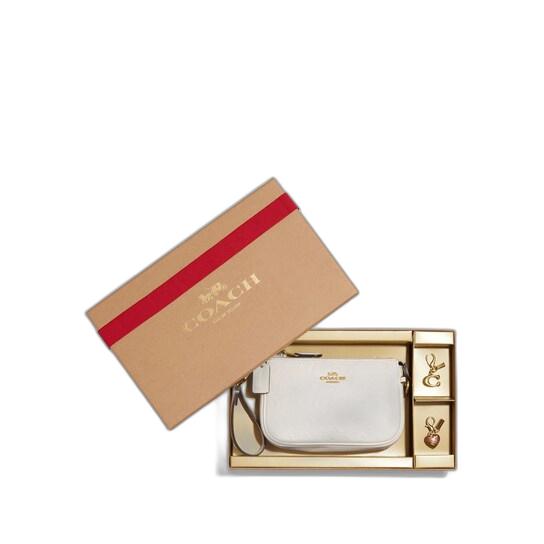 Crafted from premium smooth calf leather, this product features two convenient credit card slots and a secure zip-top closure with a soft fabric lining. The handle has a comfortable 4 1/2″ drop, making it easy to carry. Measuring 6″ (L) x 4″ (H) x 1 1/2″ (W), this product also comes with removable charms for added style. It is elegantly packaged in a Coach gift box with a ribbon (ribbon color may vary from the picture). Style No. CF549.