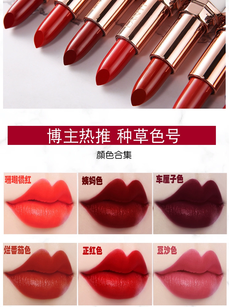 | nameOriginal | Non-fading, non-stick, aura-colored lipstick, matte, long-lasting, non-fading, moisturizing, waterproof, whitening, improving complexion |