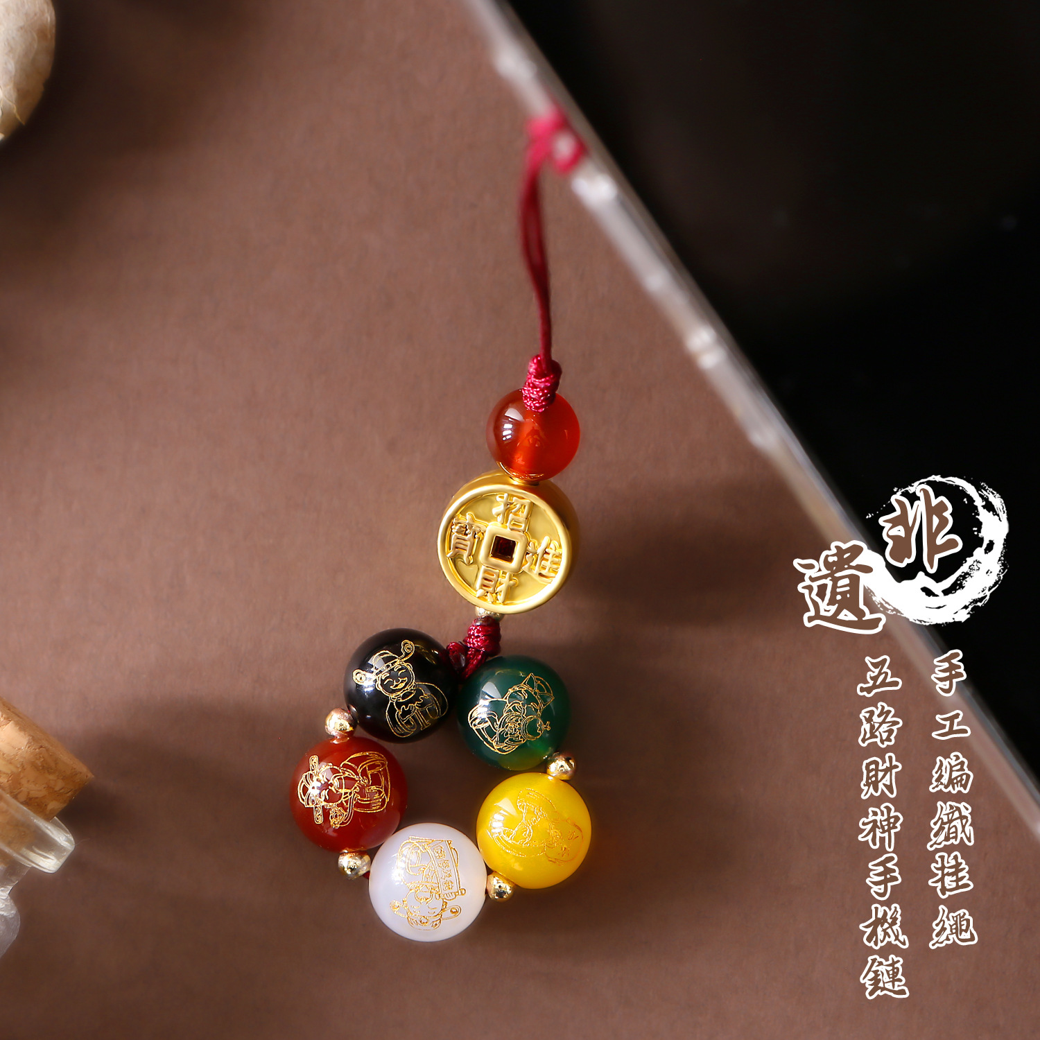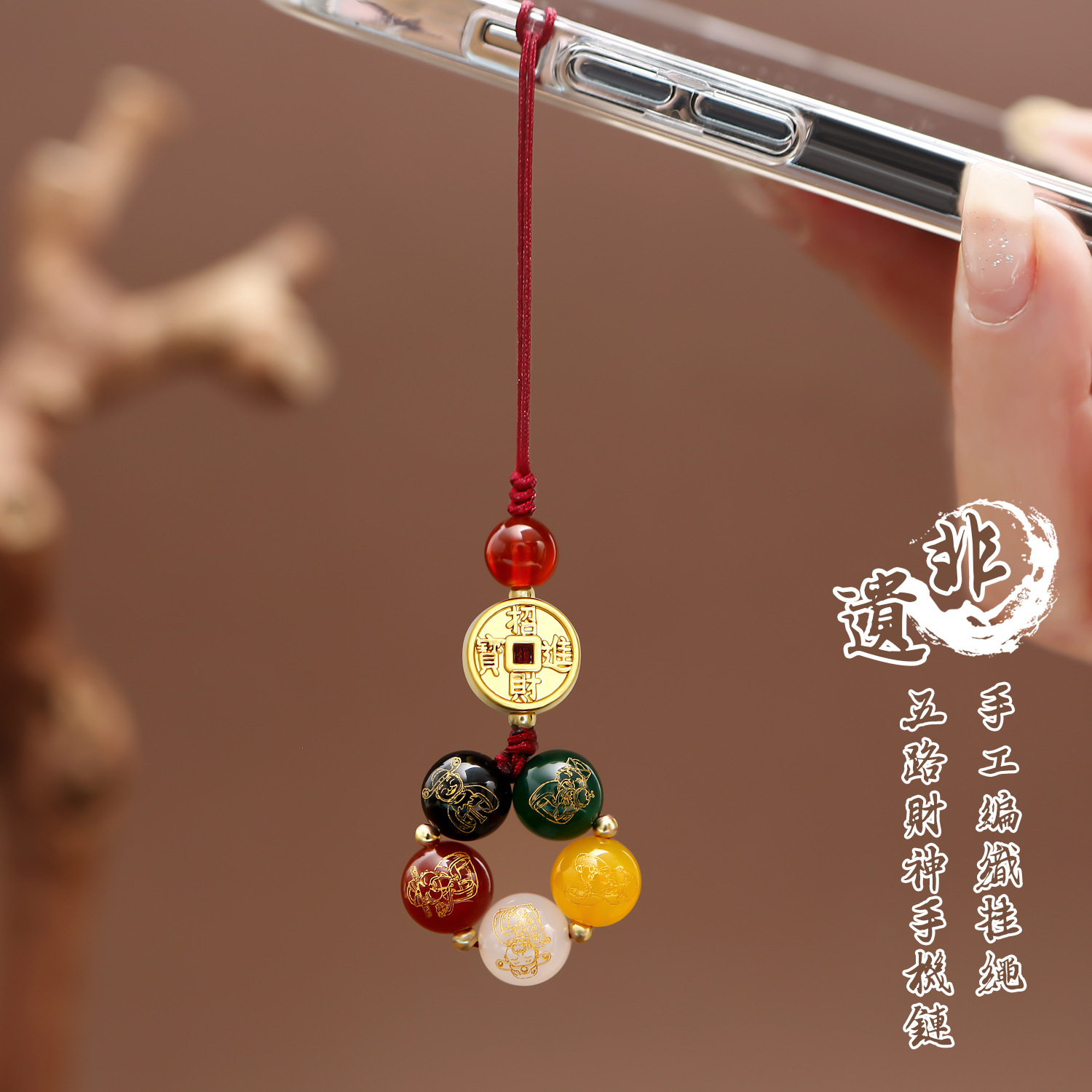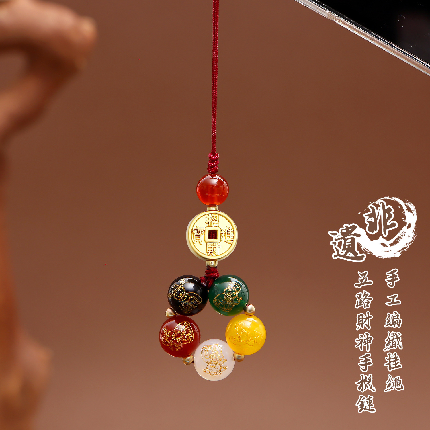 | nameOriginal | Non-heritage hand-woven five-way god of wealth mobile phone key chain pendant this year fortune transfer key mobile phone chain |