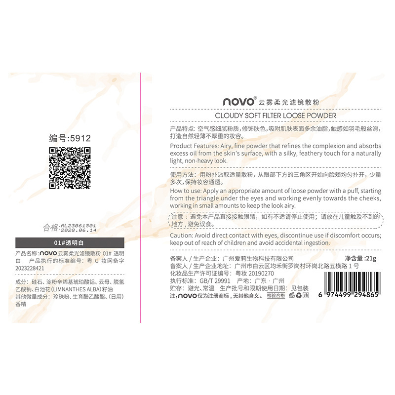 | nameOriginal | NOVO cloud mist soft light filter loose powder makeup powder oil control concealer waterproof sweat-proof non-makeup student party honey cake |