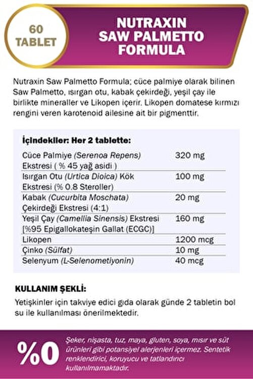 Nutraxin Saw Plametto Formula Known as dwarf palm, Saw Palmetto contains minerals and lycopene along with nettle, pumpkin seeds, green tea. Lycopene is a pigment belonging to the caratoneid family, which gives the tomato its red color.