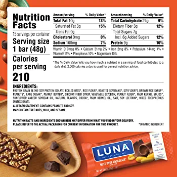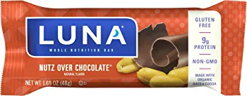 | nameOriginal | LUNA BAR – Gluten Free Snack Bars – Nutz Over Chocolate Flavor – 9g of protein – Non-GMO – Plant-Based Wholesome Snacking – On the Go Snacks (1.69 Ounce Snack Bars, 15 Count) |