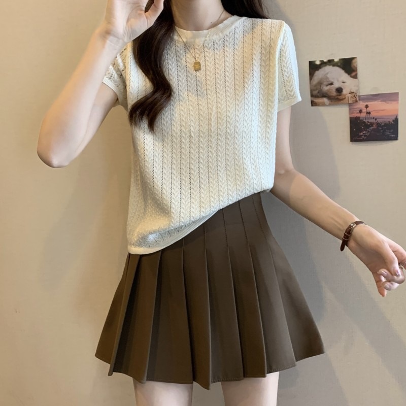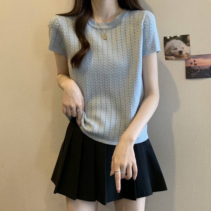 | nameOriginal | Oat Grey Twist Knitwear Shoulder Short-sleeved T-shirt Women's Summer Large Size Unique Small Shirt for Chubby Girls Age-reducing Top |