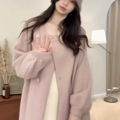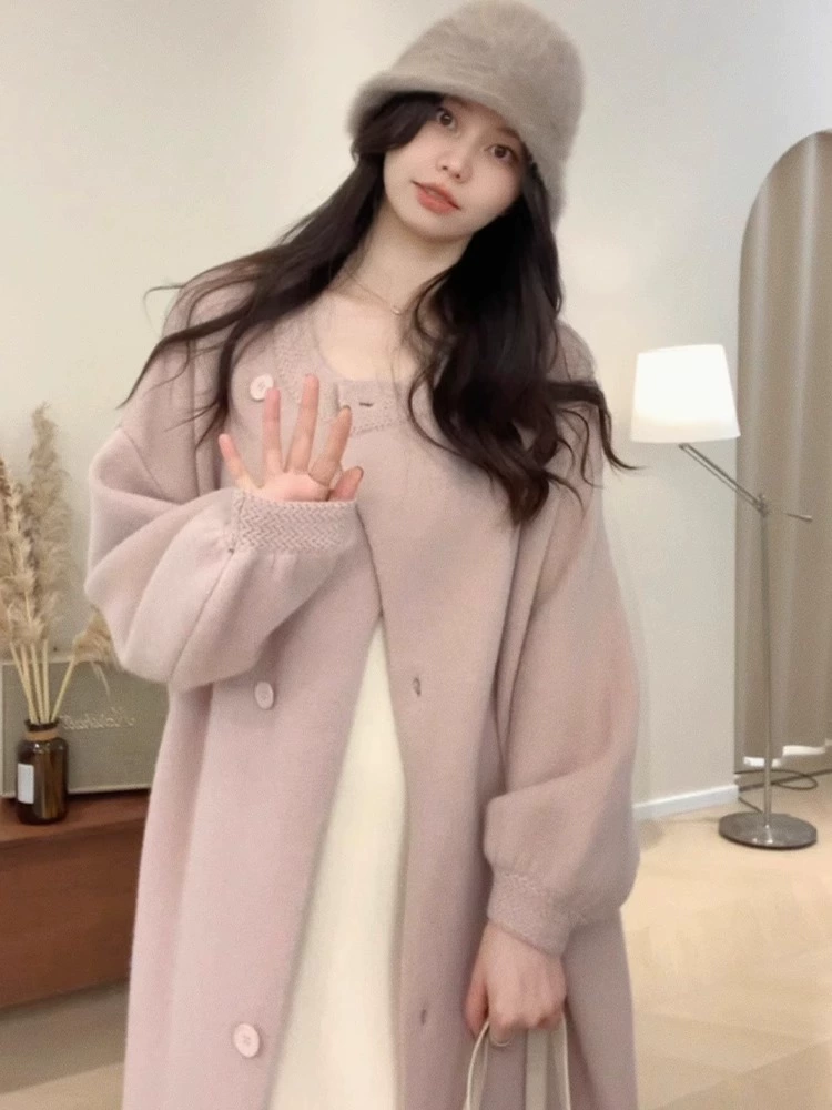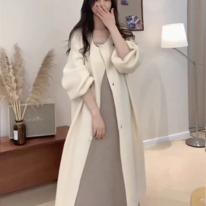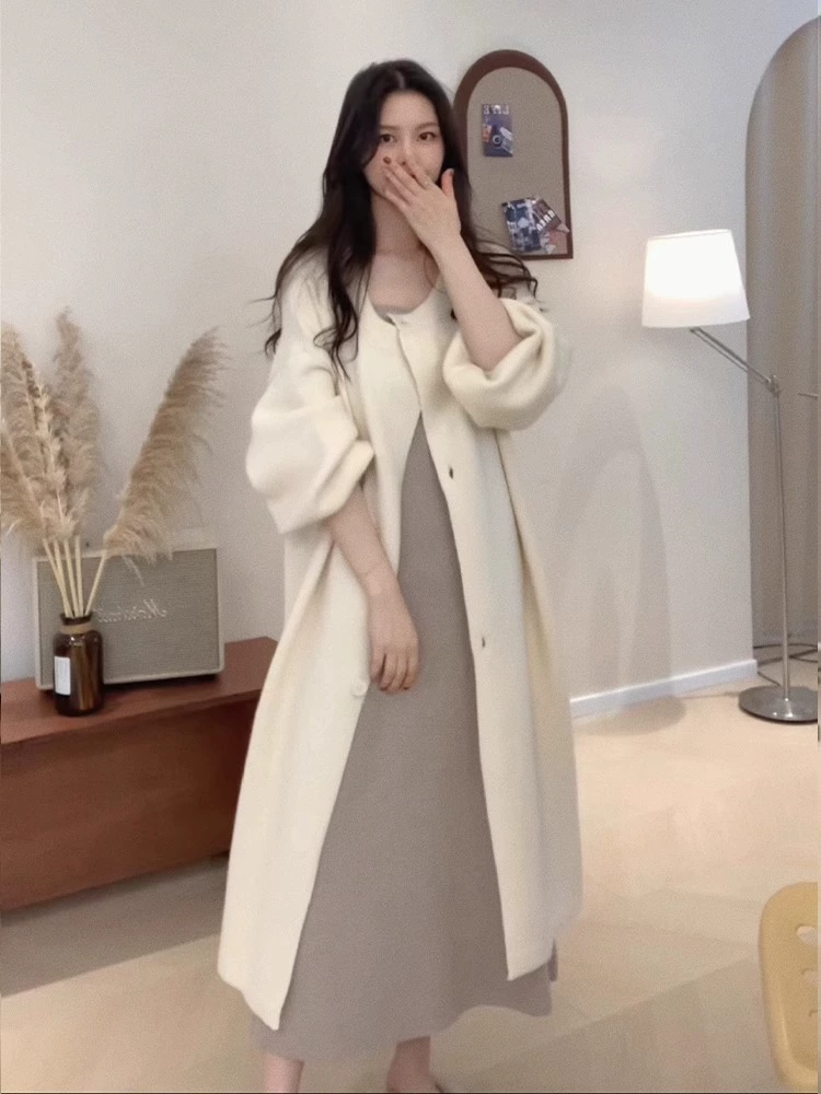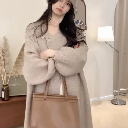 | nameOriginal | Oatmeal lantern sleeve round neck knitted cardigan coat |
