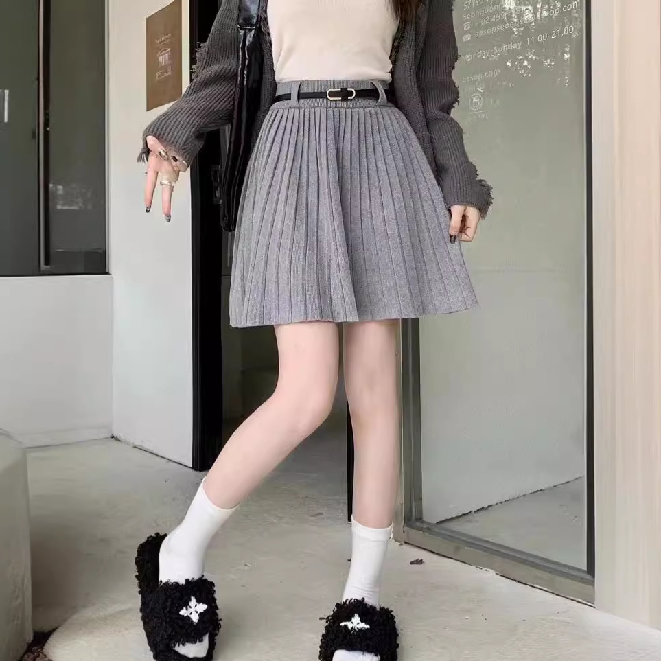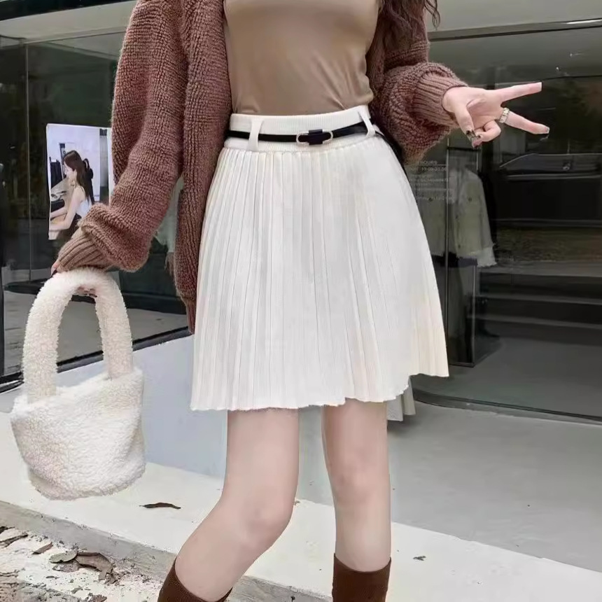 Oatmeal Lazy Style Knitted Pleated Skirt Women’s Autumn and Winter High Waist Draped Small Slim A- line JK Skirt