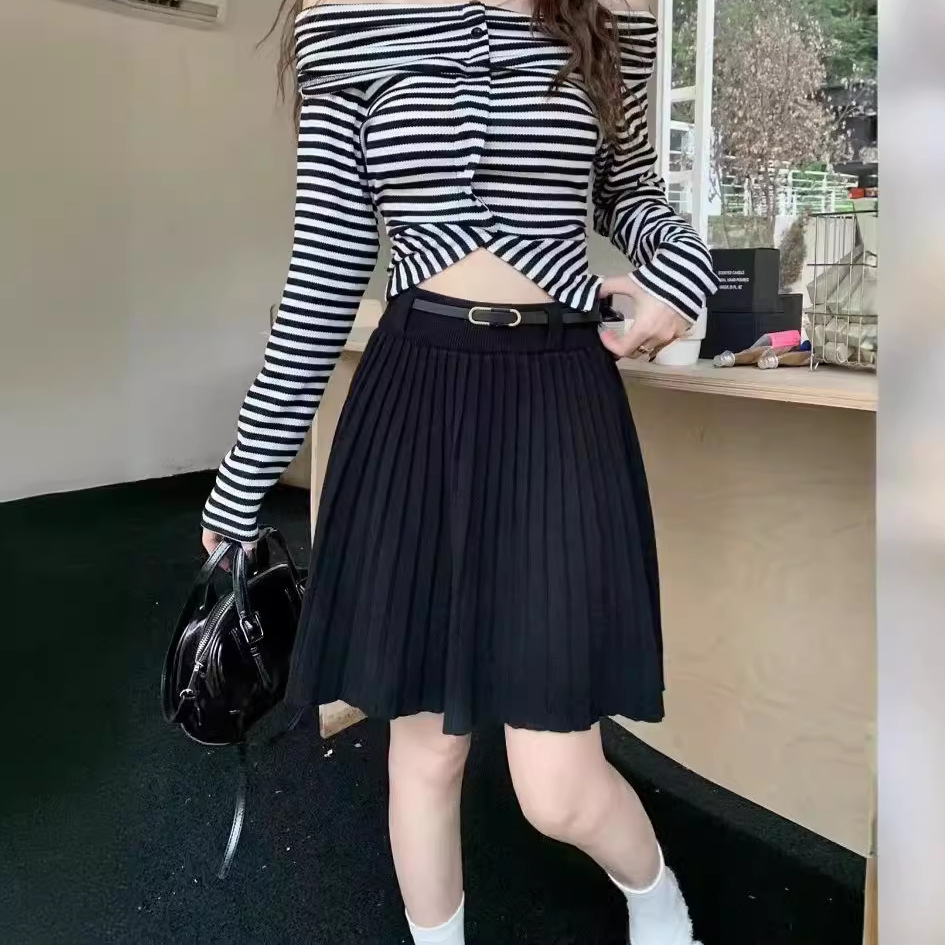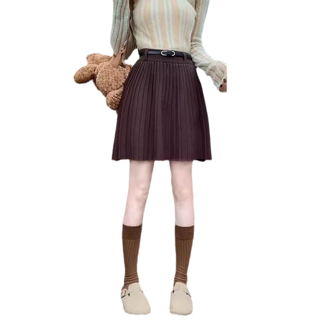 Oatmeal Lazy Style Knitted Pleated Skirt Women's Autumn and Winter High Waist Draped Small Slim A- line JK Skirt